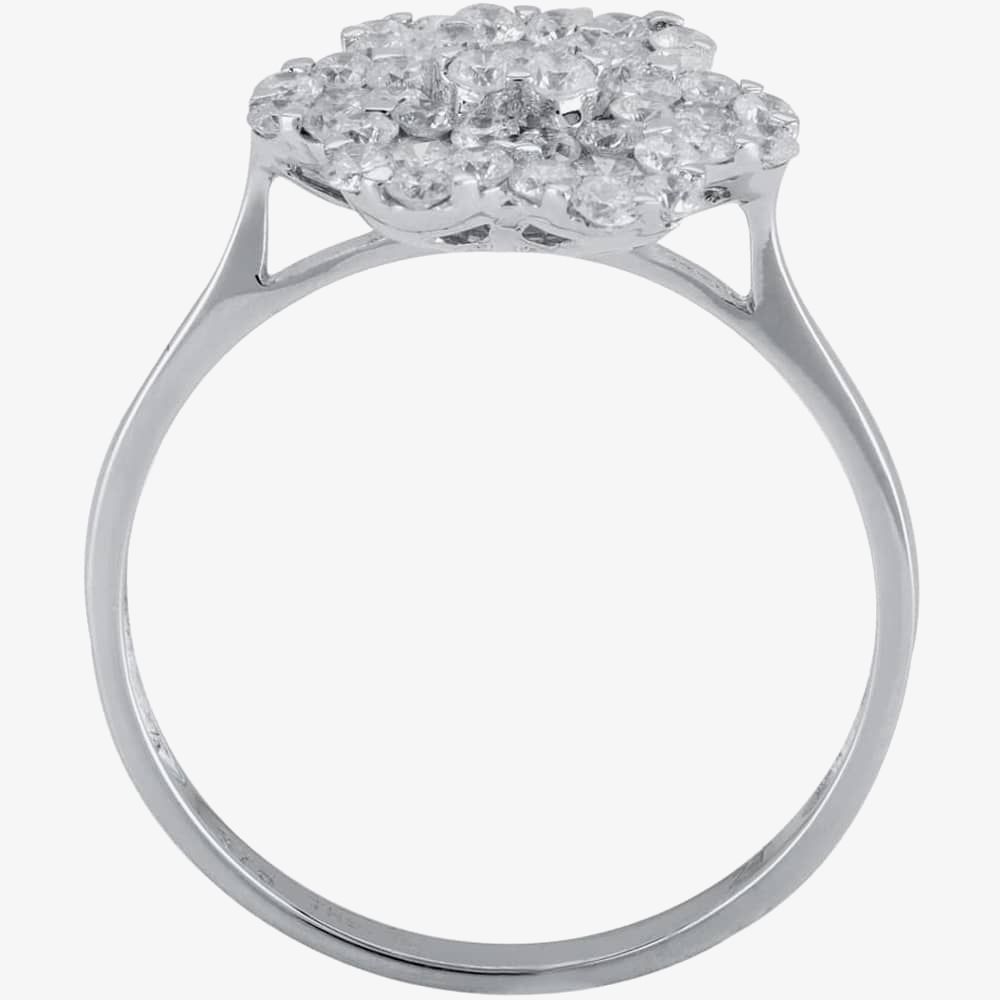 Clusters of round brilliant diamonds have been shaped into round petals to create the floral shape of these beautiful dress ring.