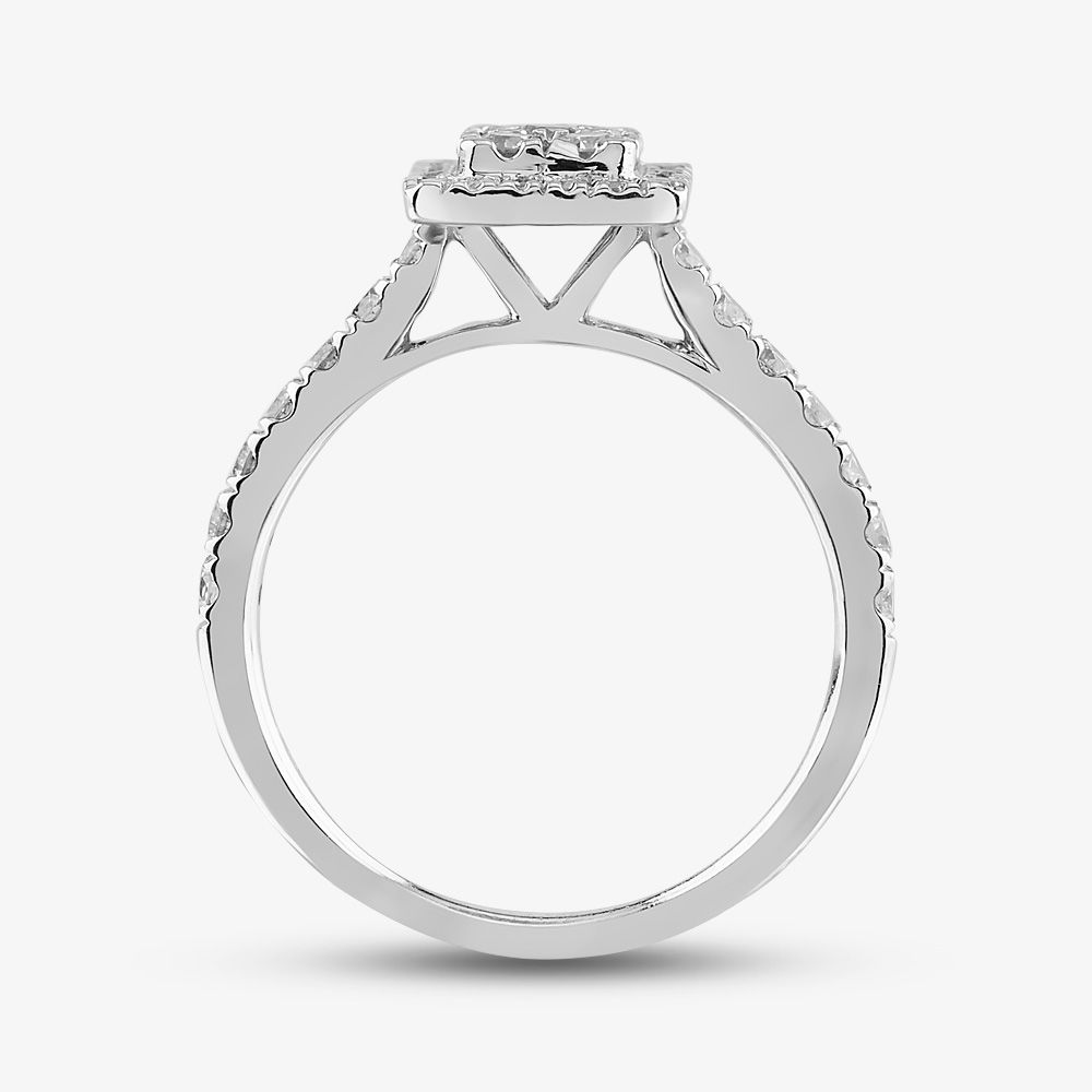 A stunning cluster ring which has been created in 9ct white gold and features an oblong shape design set with round cut diamonds with diamond surround and set shoulders which altogether catch the light and glisten beautifully. This contemporary cluster ring is the perfect choice for your loved one.