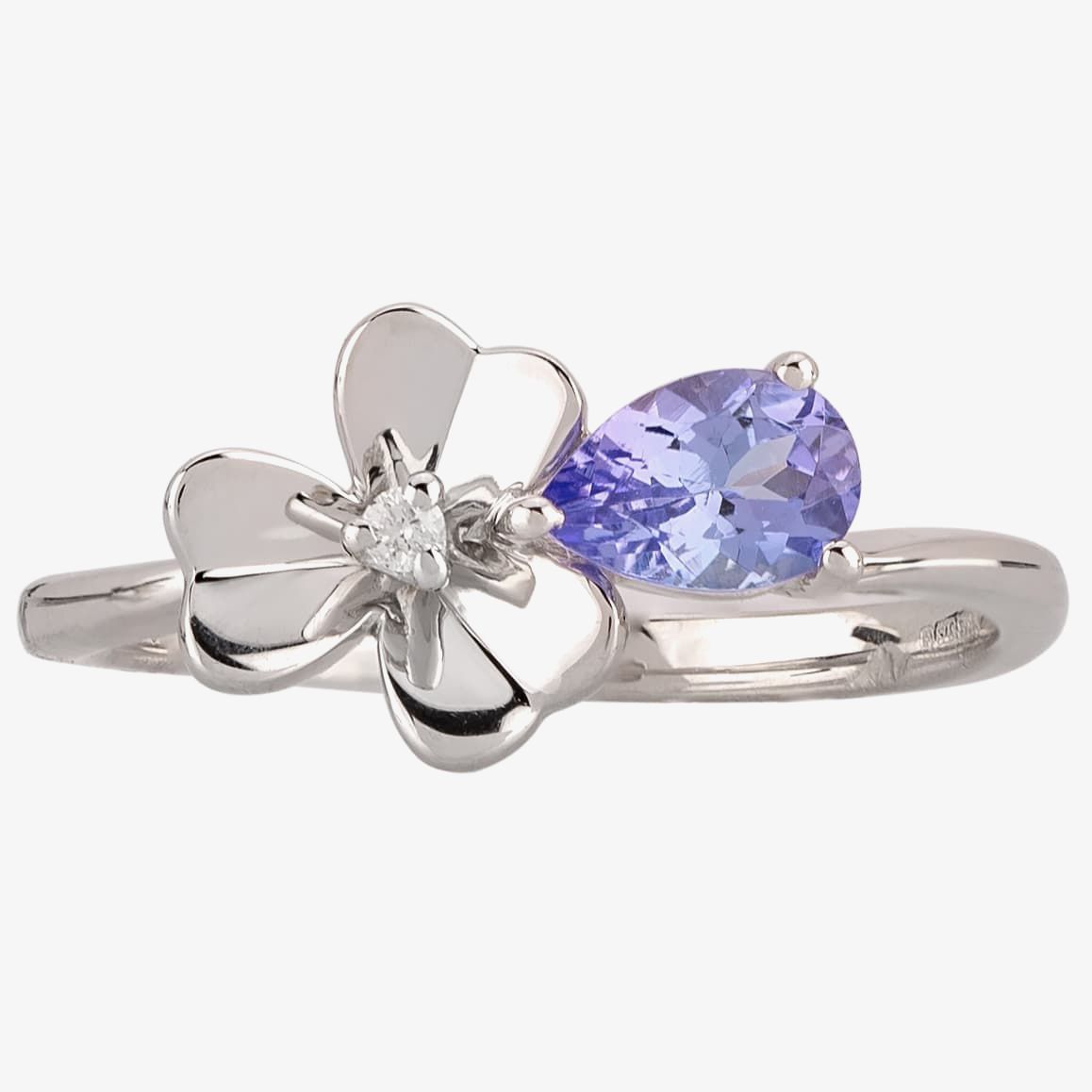 A gorgeous 9ct white gold ring with a floral design. This beautifully crafted ring boasts a flower shape with a diamond center and a pear shaped tanzanite claw set stone. The sparkling tanzanite stone is complimented by a shimmering 9ct white gold band. The perfect gift for your special someone, buy with confidence.