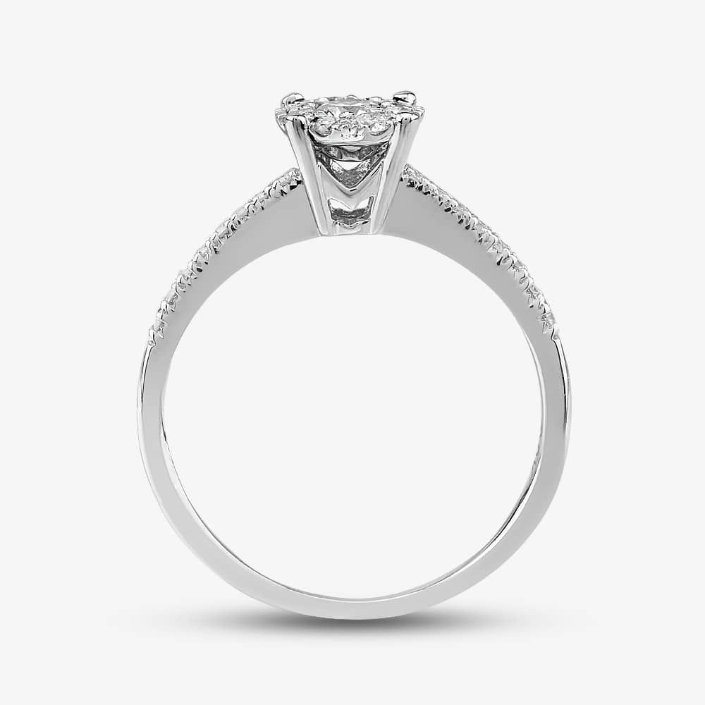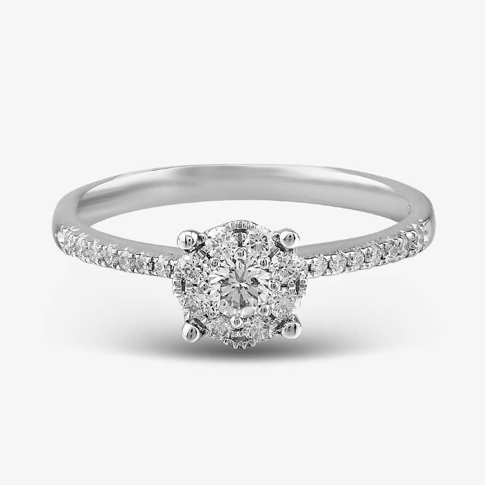 A modern cluster ring which is created in 9ct white gold & features an attractive round cluster design with diamond set shoulders which altogether catches the light beautifully. Ideal as a stand-alone piece or perfect for layering or stacking with other rings to create your own unique look.