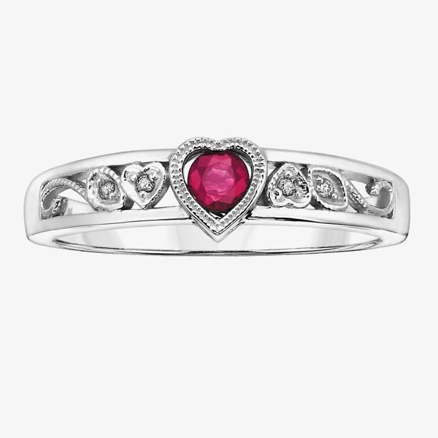 This pretty dress ring features a tension-set ruby in a beaded heart frame upon an openwork band with diamond-studded leaves and hearts.