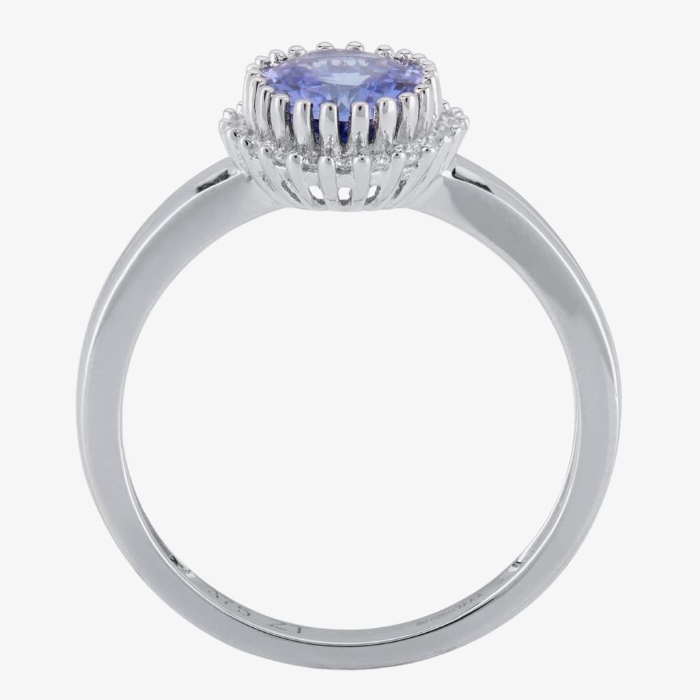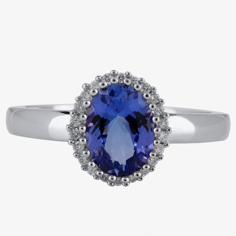 This attractive cluster ring is crafted in 9ct white gold & features an oval 1.66ct tanzanite centre stone with a sparkling halo of 22 white diamond surrounding, with a total carat weight of 0.11ct. This ring is a perfect stand-alone piece or ideal for layering & combining with other rings to create your own unique look.