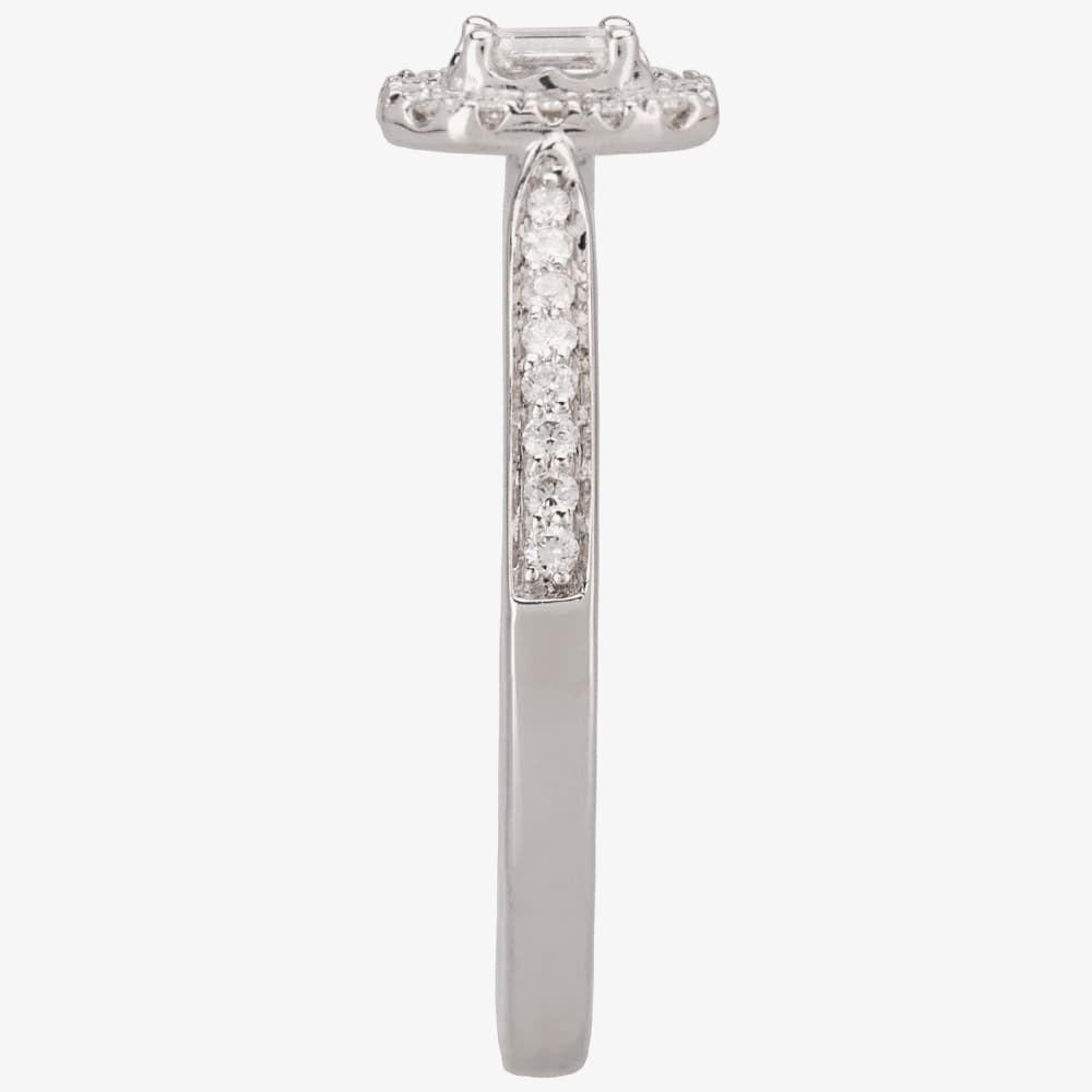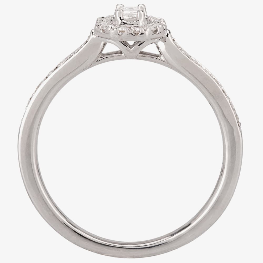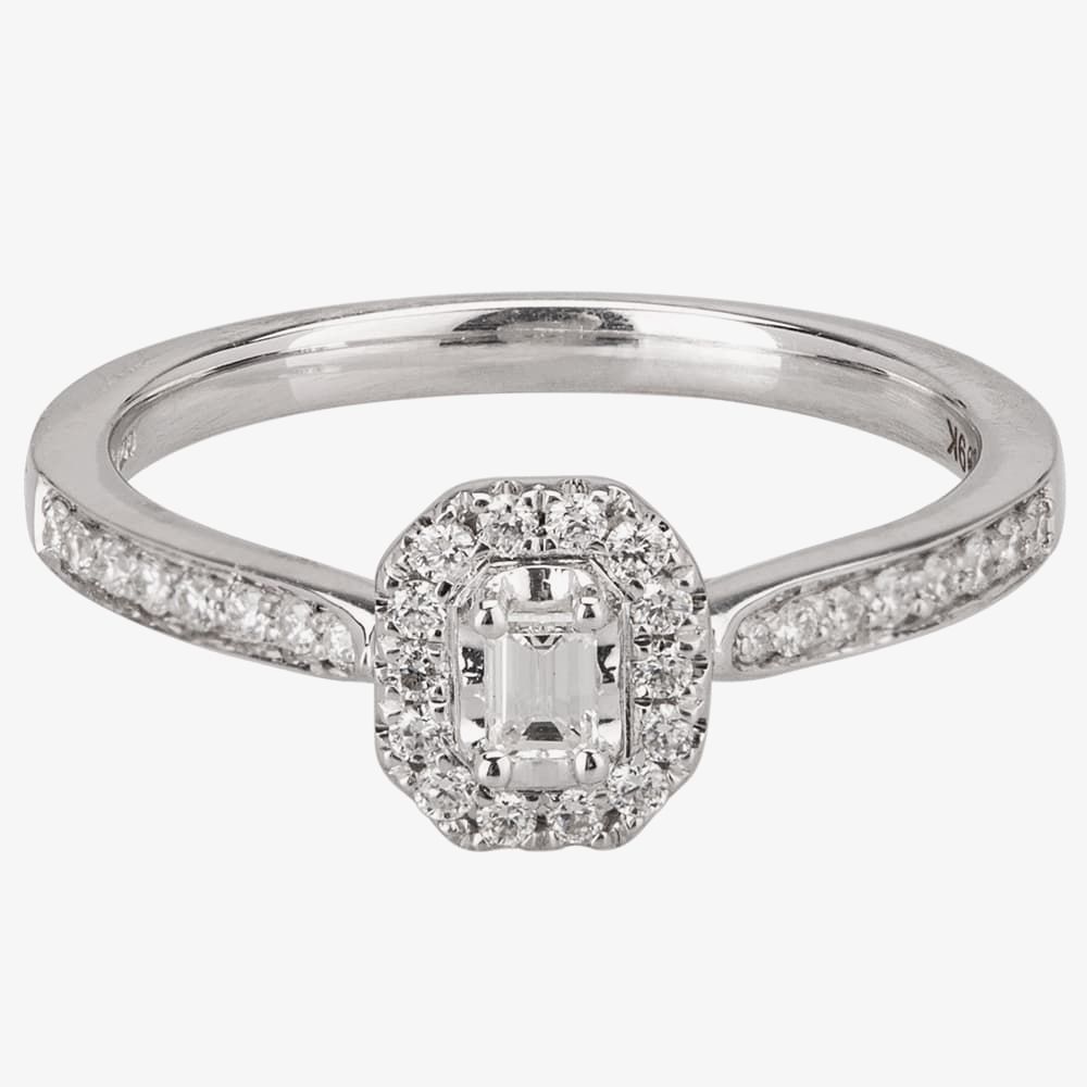 A delicate white gold tapered band inlaid with pavé shoulders creates the most perfect setting for a sparkling emerald-cut diamond surrounded by a halo of round cluster stones.