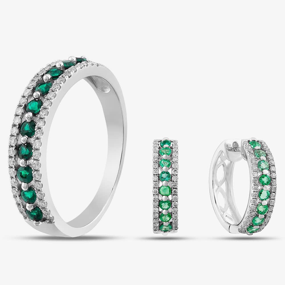 Exquisitely crafted from 9ct white gold, this quatrefoil-shaped jewellery set combines white diamonds with green emerald stones. This beautiful design features a cluster of brilliant-cut emeralds surrounded by brilliant-cut white diamonds. These stylish hoop earrings are completed with a hinge closure making them easy to take on and off and are secure enough to keep them in place all day. This set is sure to turn heads and make a statement and is the perfect gift for that someone special.