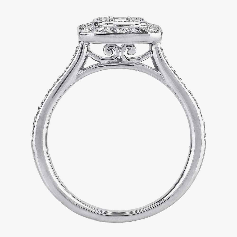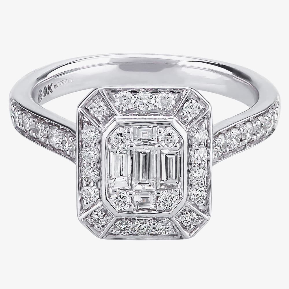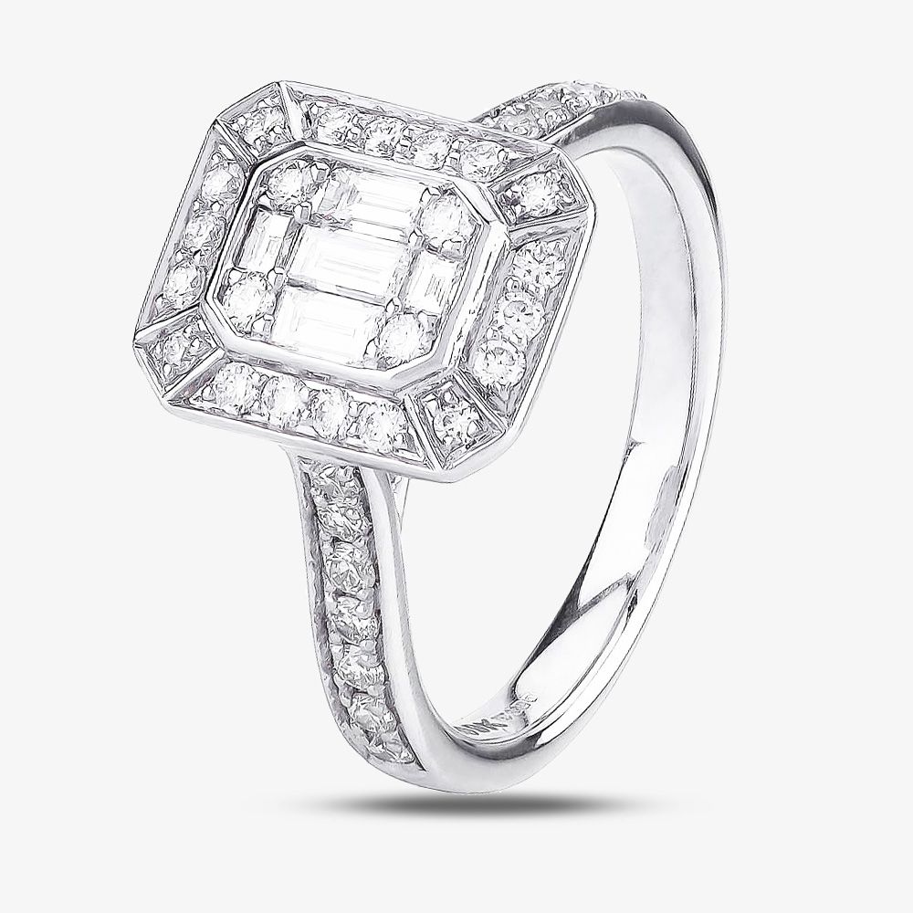 Three 0.12ct and two 0.03ct bezel-set baguette-cut stones form the central mosaic with four small round brilliant gems, before being surrounded by sixteen larger round diamonds to form the radiant-shaped cluster. Channels in the shoulders are then bead-set with smaller pavé diamonds, before the mount is raised up on cut-out shoulders featuring curlicue architecture for that extra flash of extravagance.