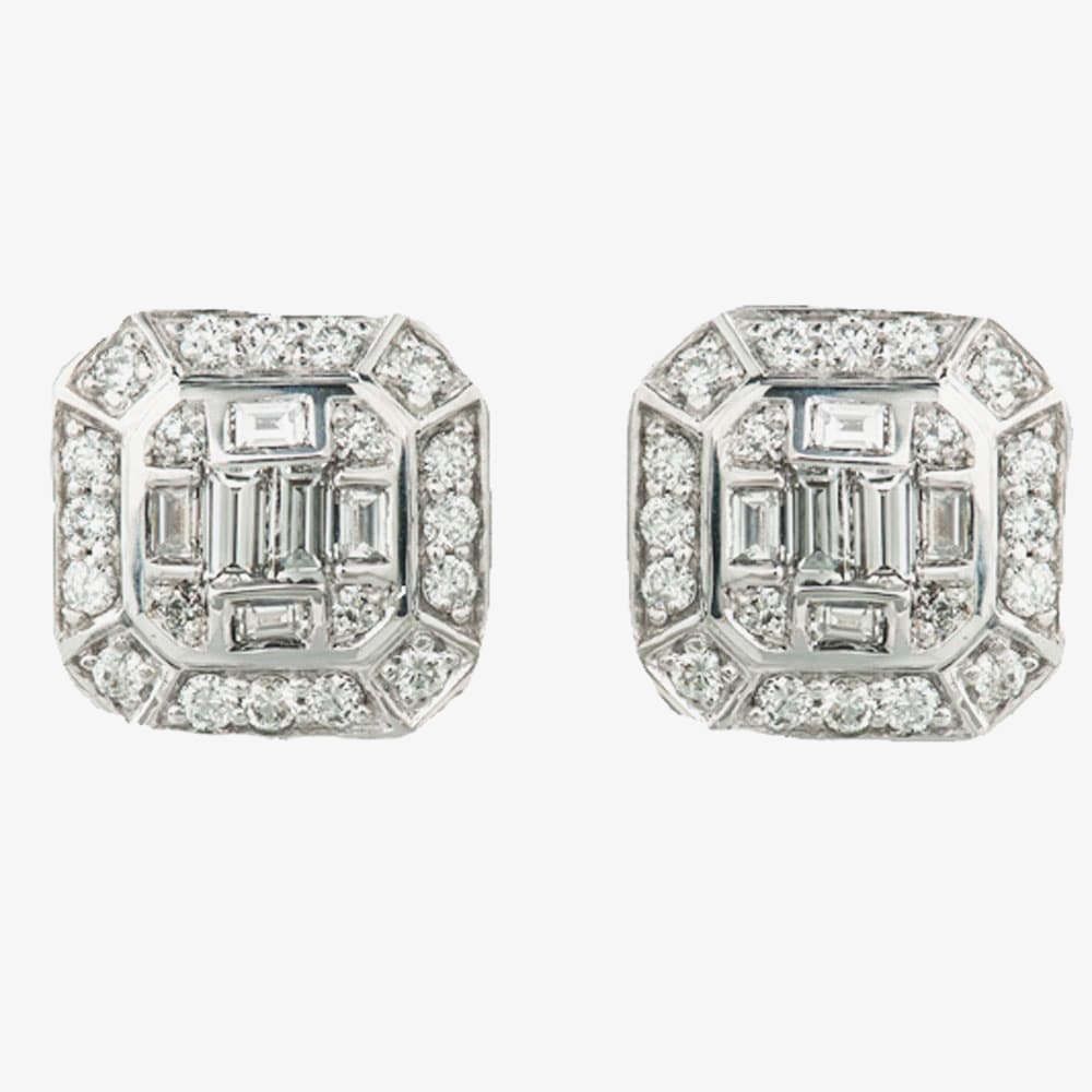 These unusual mosaic stud earrings combine two different sizes of baguette-cut stones with twenty round brilliant diamonds to produce radiant-cut style arrangements.