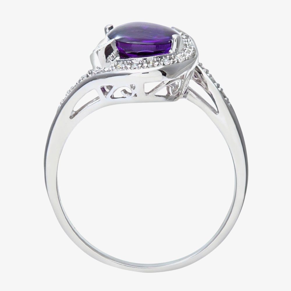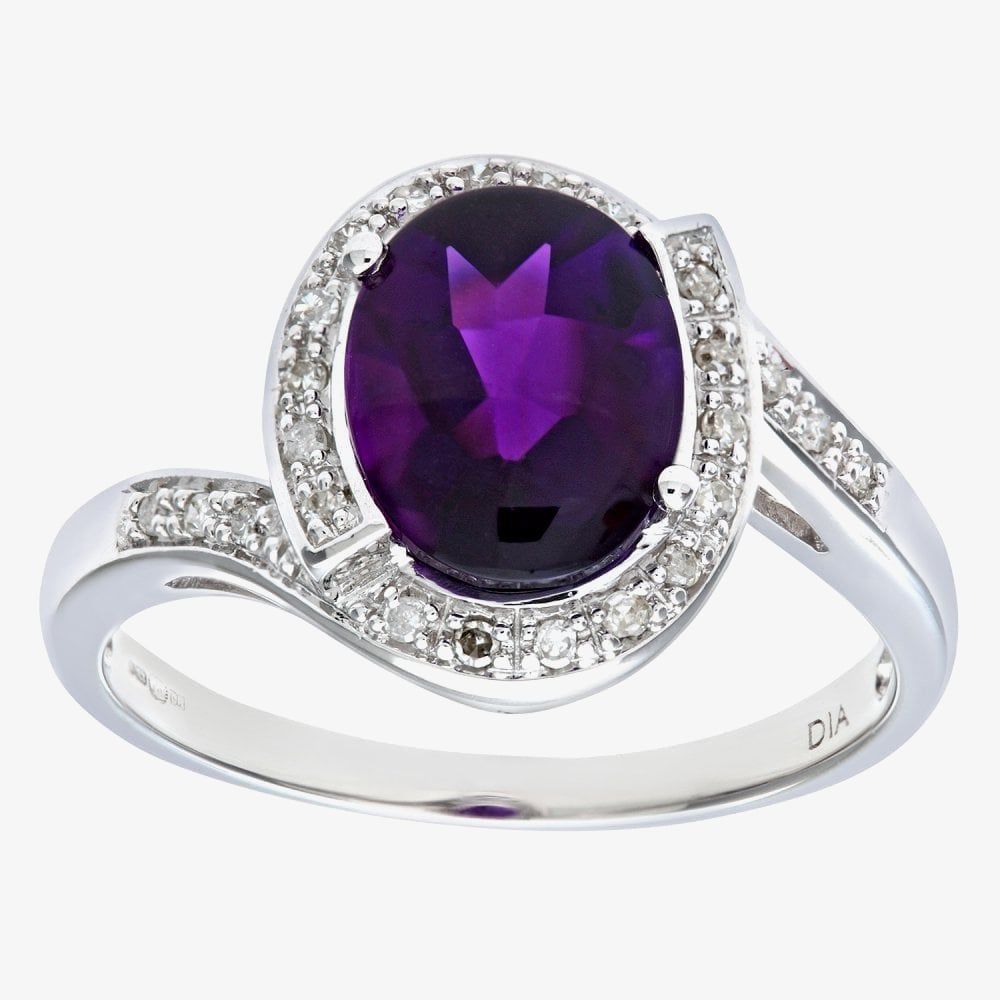 This modern twist ring is crafted in 9ct white gold & features an oval amethyst with a sparkling diamond surround & shoulders design which have a total carat weight of 0.10ct. This ring is a perfect stand-alone piece or ideal for layering & combining with other rings to create your own unique look.