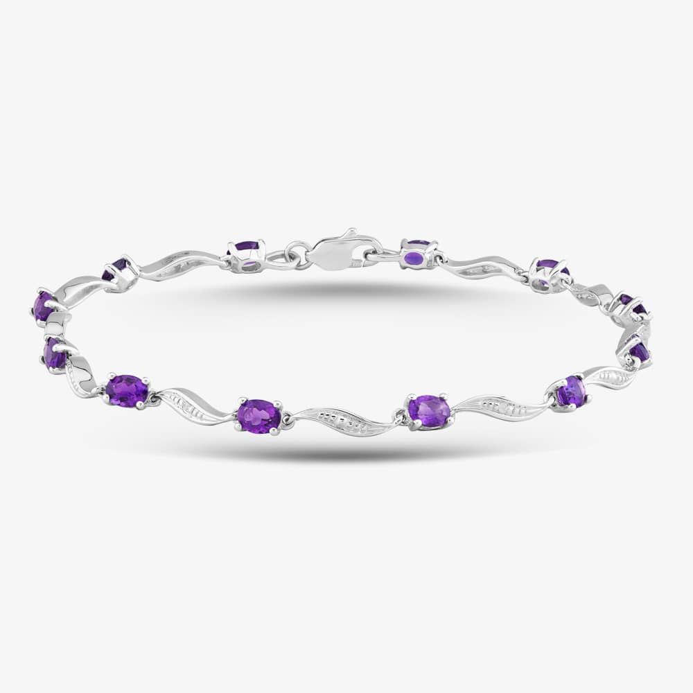 The 9ct yellow gold bracelet is designed in an elegant wave style, adorned with mesmerising purple amethysts and shimmering brilliant-cut white diamonds. The graceful undulation of the wave design, accentuated by the regal purple of the amethysts and the sparkle of diamonds, creates a beautiful piece.
