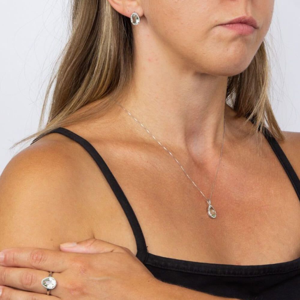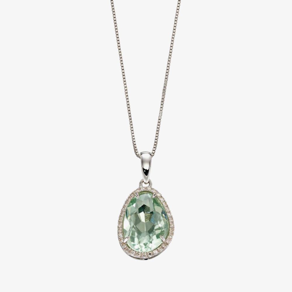Created in a luxurious White Gold, this stunning pendant necklace features a pear shaped green fluorite stone that is accentuated by a halo of diamonds.