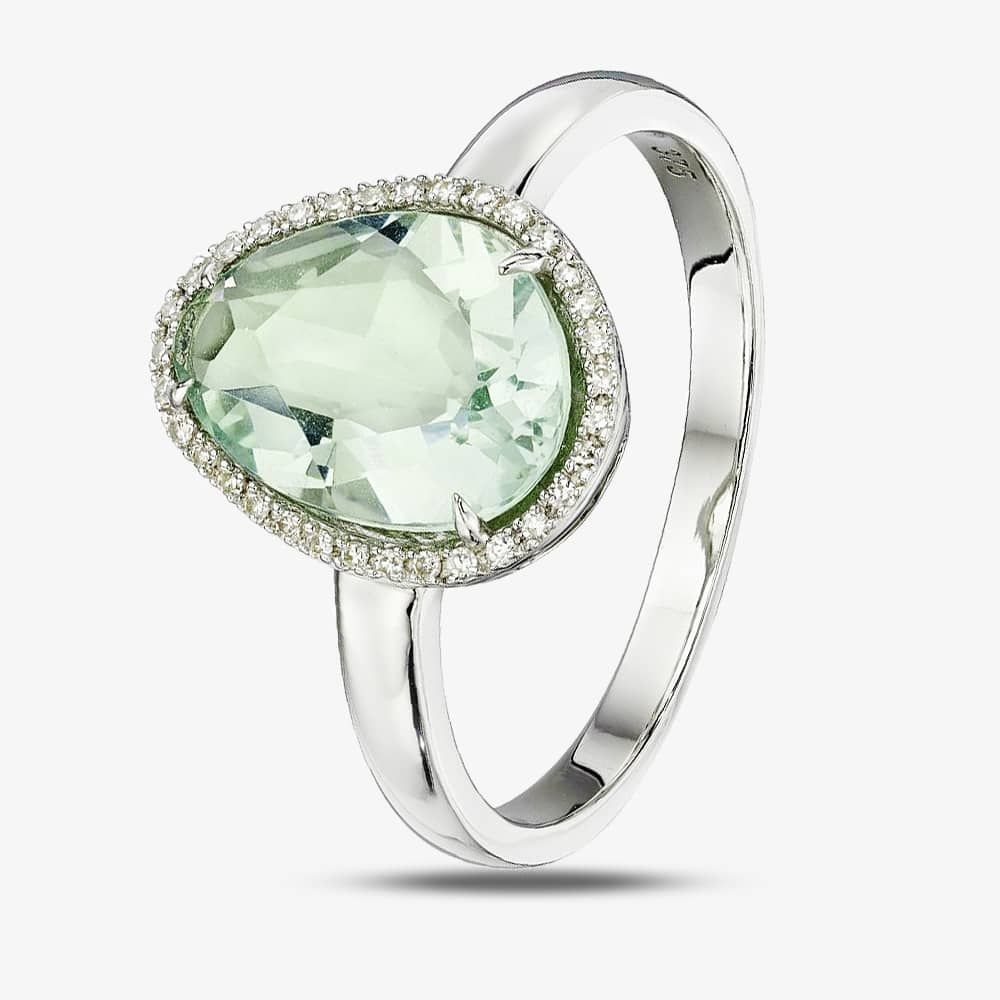 Created in a luxurious white gold, this stunning ring features a pear shaped green fluorite stone that is accentuated by a halo of diamonds.