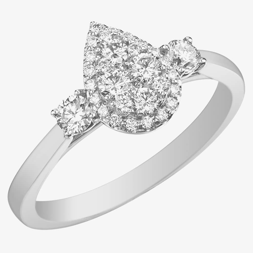 9ct White Gold Pear Shaped 0.5ct Diamond Shoulder Cluster Ring 31138YW/50-9. This stunning ring features a pear-shaped cluster of clear diamonds, with two single diamonds on the shoulders of the ring. Each stone is set in place with four claws. In total, this beautiful ring features 32 clear diamonds with a total weight of 0.5ct.