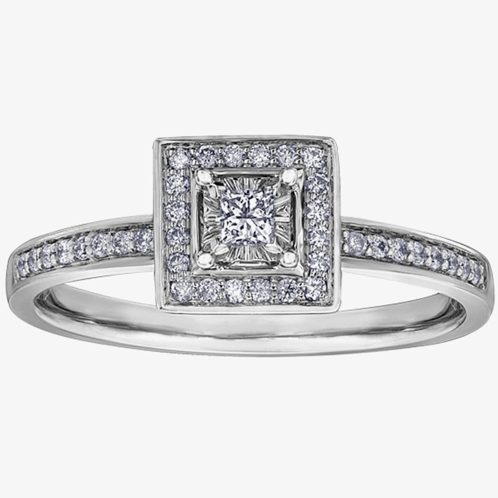 A 0.06ct illusion-set Princess-cut diamond is the centrepiece of this pretty cluster ring. A square halo of twenty pavé stones is embedded into the shaped mount, before the piece is completed by the clawed round brilliant diamond shoulders, set within a narrow channel for a smooth rubover finish. A matching wedding ring (9ct White Gold 0.08ct Diamond Half-Eternity Wedding Ring 30388WDWG/20-10) is also available).