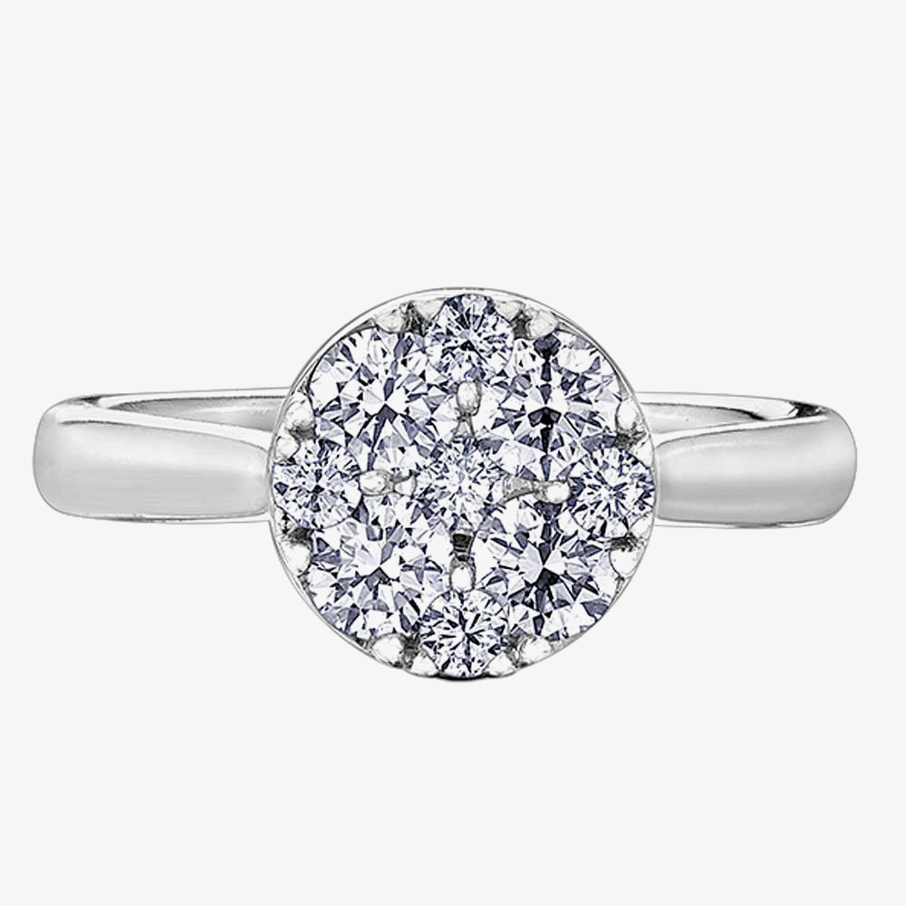 This sparkling engagement ring consists of nine stones in the centrepiece, four 0.05ct round brilliant diamonds and five smaller subtle stones to create the cluster head.