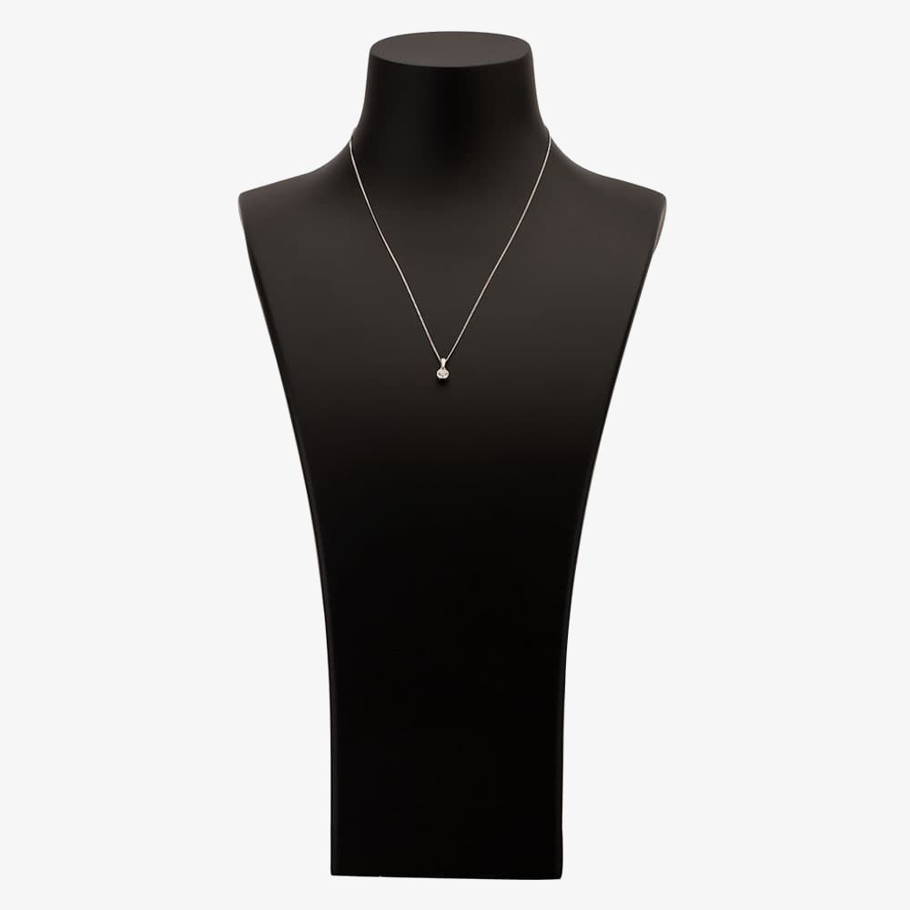 This stunning solitaire pendant would be a perfect part of your bridal set. The gorgeous white gold hue of the bezel provides a startling contrast next to the distinctive diamond it secures.