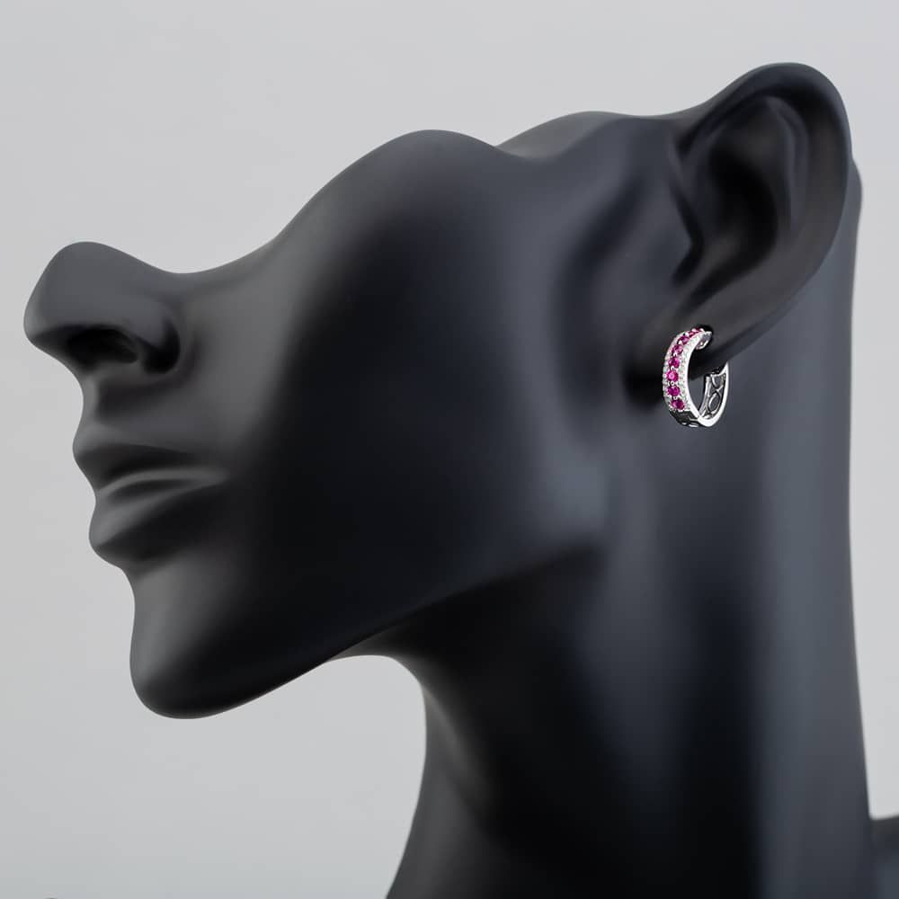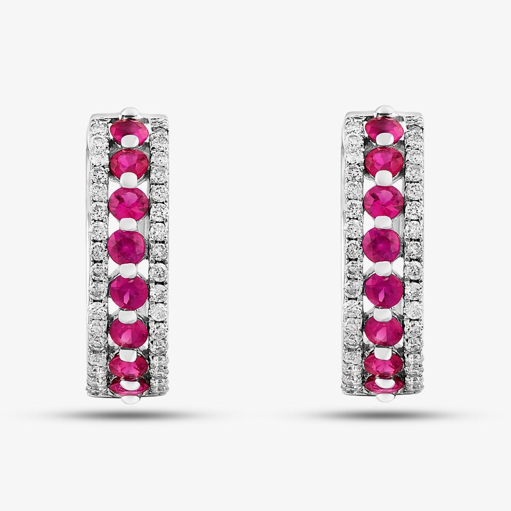 Make a statement with these eye-catching earrings which have been elegantly created in 9ct white gold and feature a three-row design set with vivid ruby stones and sparkling round cut diamonds. These stylish hoop earrings are completed with a hinge closure making them easy to take on and off and are secure enough to keep them in place all day. The perfect gift for that someone special.