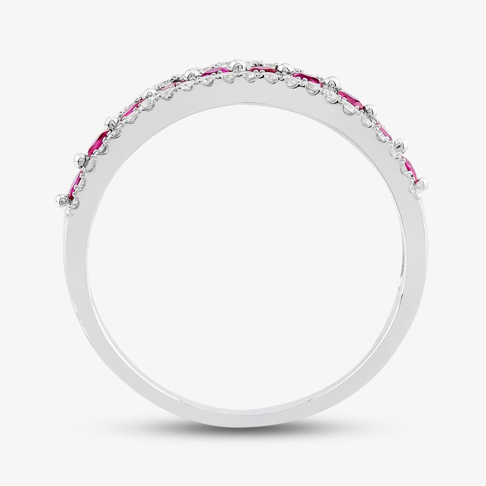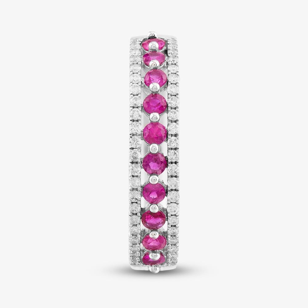 Exquisitely crafted from 9ct white gold, this half-eternity is a sight to behold. This beautiful ring is adorned with a row of brilliant-cut rubies, accentuated further with brilliant-cut white diamonds set either side, in a classic central four claw setting.
