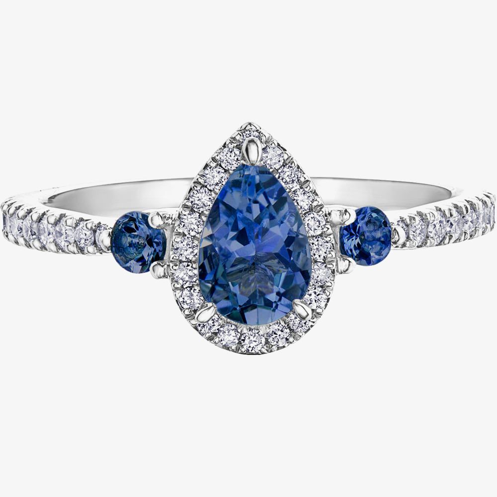 Created in 9ct White Gold, this beautiful ring features a pear-cut sapphire stone and is framed by sparkling diamonds. The diamond set shoulders also feature a further two sapphire stones. This elegant ring contains 44 diamonds in total, giving a total weight of 0.42ct.