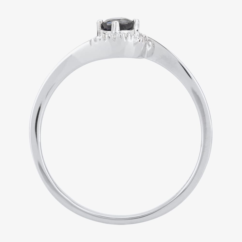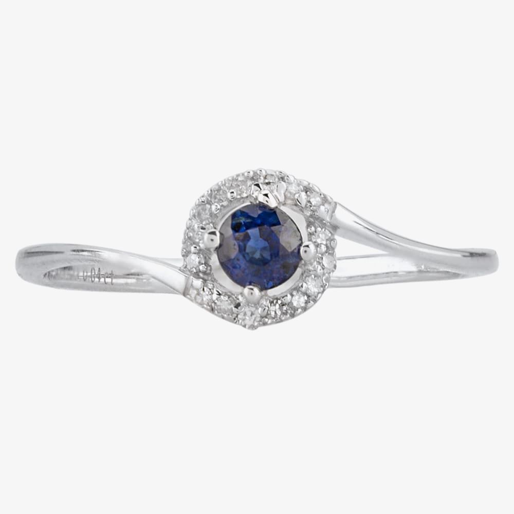 A beautifully crafted 9ct white gold cluster ring. This stunning ring features a delicate twist design with a deep blue faceted claw set sapphire surrounded by a white diamond cluster halo. The halo is set with 16 luxurious diamonds with a 0.04 carat grading, with a beautiful blue sapphire measuring 3.5mm at its center. Perfectly finished in 9ct white gold, this exquisite ring is the perfect gift to express your ever lasting love or to pop that important question. Buy with confidence.