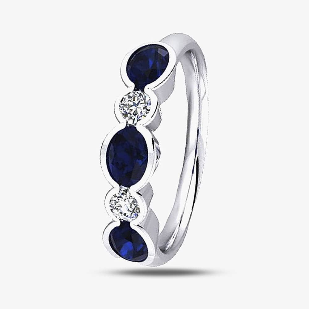 This stunning half eternity ring has been crafted in 9ct white gold & features three 4 x 3 mm oval cut striking blue sapphire stones with two round sparkling diamonds in-between which is all finished in a rub over setting. This ring is ideal as a statement stand-alone piece or layered & combined with other rings to create your own unique look.