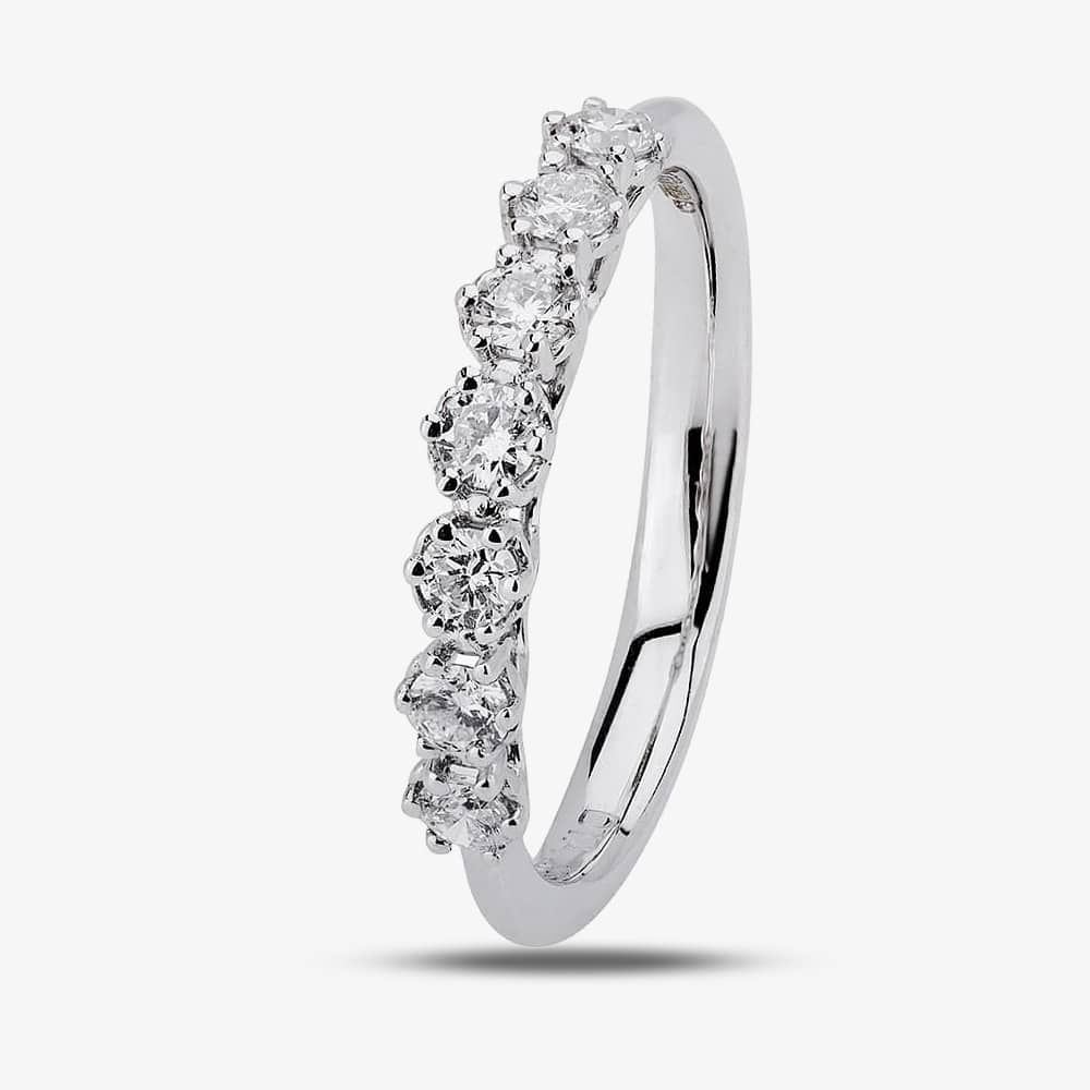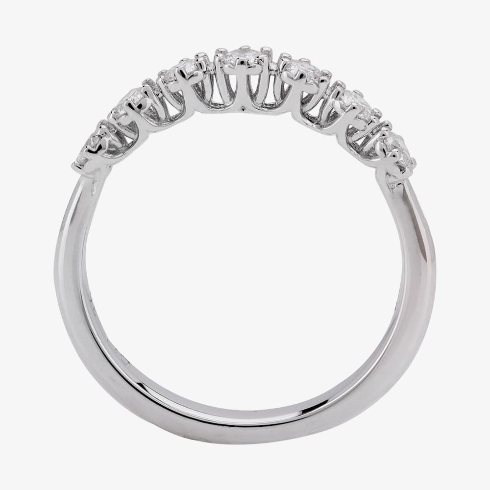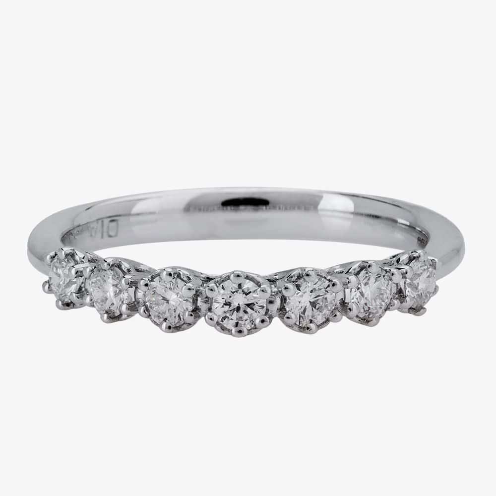 Seven beautiful diamonds have been mounted into six-claw Tiffany settings to produce this eye-catching eternity band. The deep pronged claws have combined to form a trellis bridge with the central stone raised highest of all.