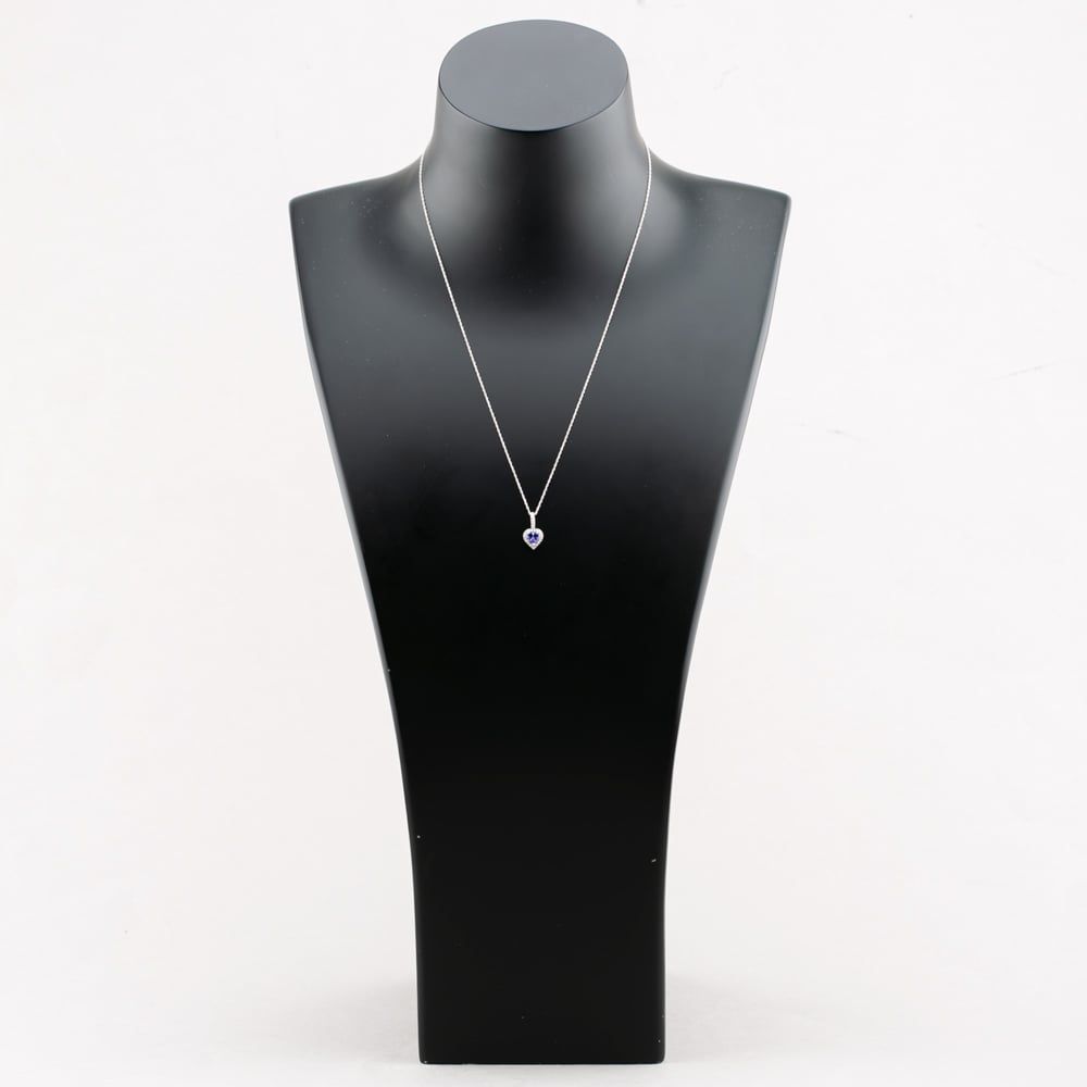 A beautiful heart shaped tanzanite held securely in a three claw setting to allow maximum light to pass through for enhanced sparkle, sits at the centre of this elegant pendant necklace. Round cut, white diamonds adorn the bale and surround the tanzanite set in radiant 9ct white gold. Suspended from an 18-inch trace chain, this necklace is perfect for gifting and wearing on special occasions.