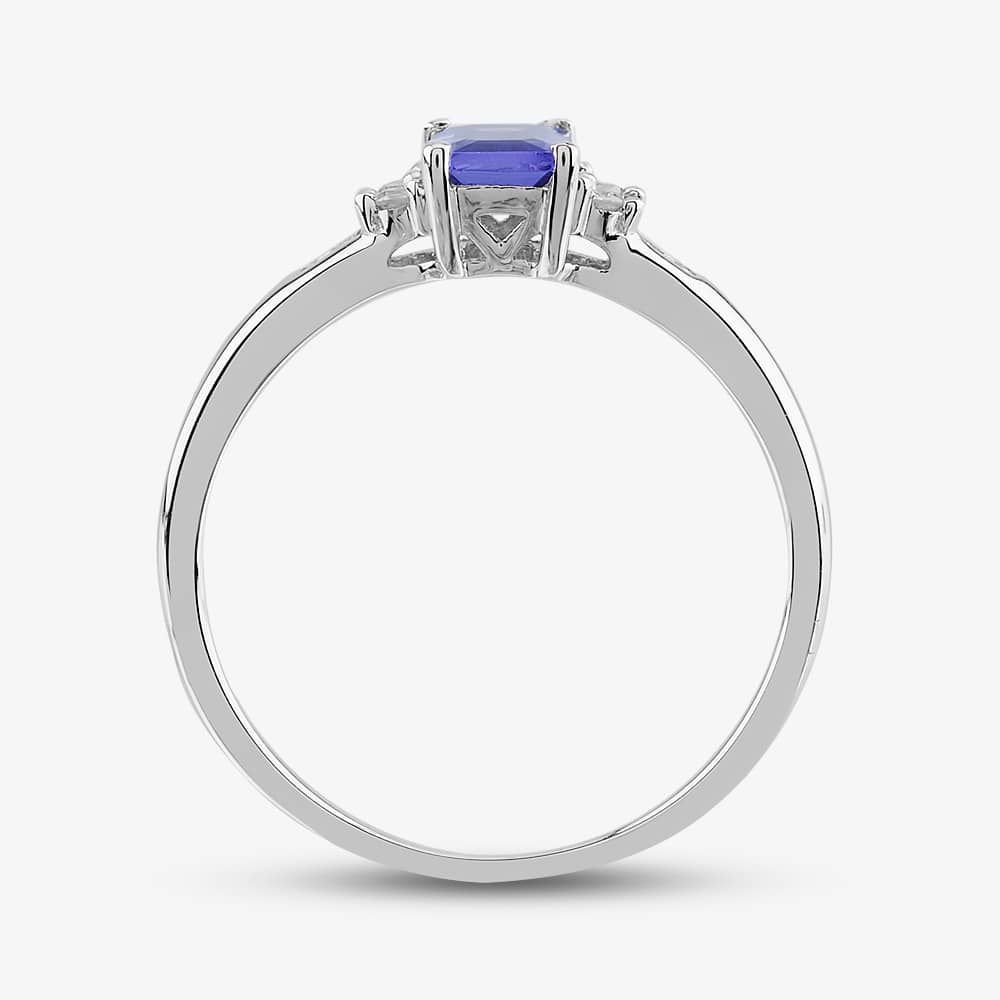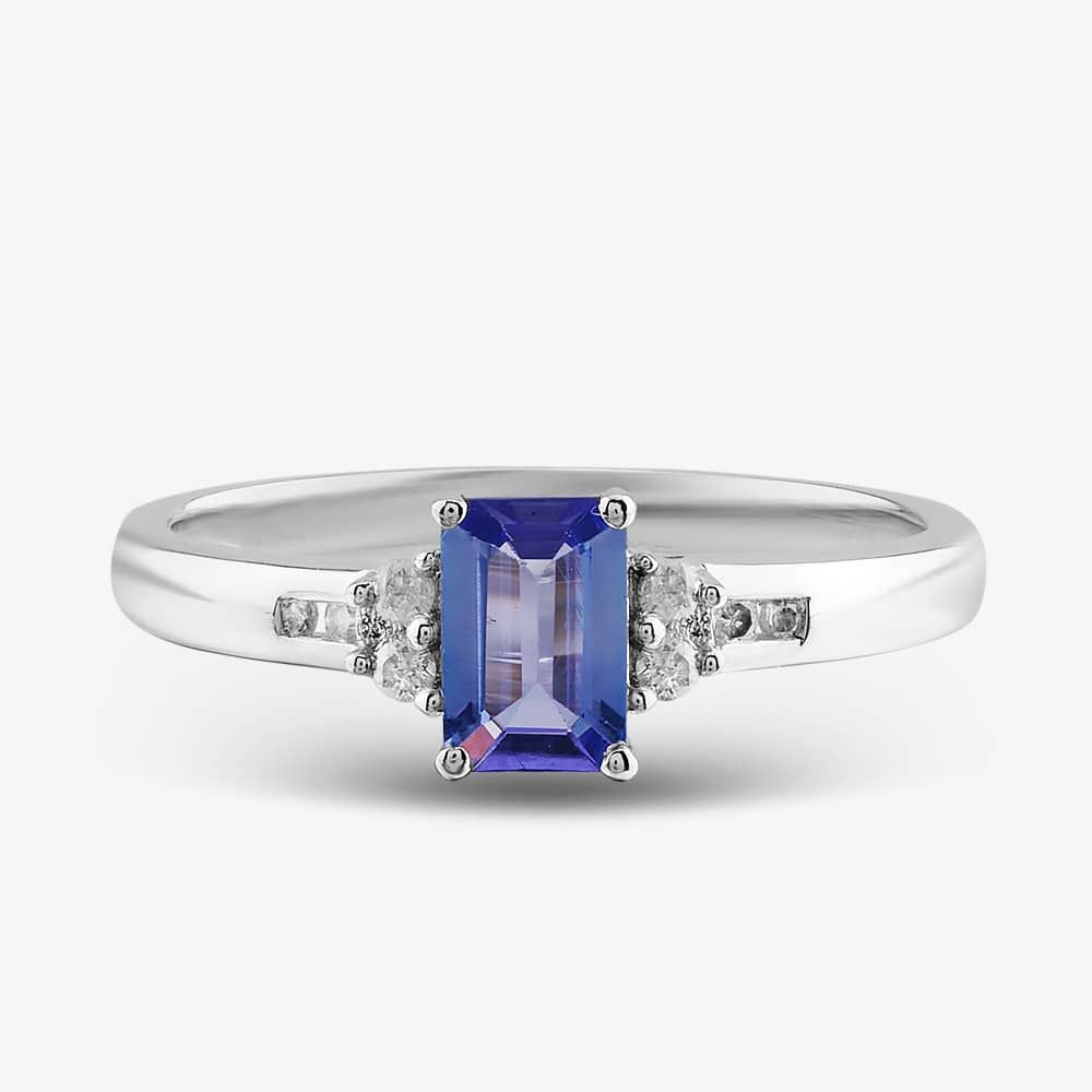 This exquisite shoulder-set solitaire ring is a masterpiece of craftsmanship. This exquisite piece of jewellery is delicately crafted from 9ct white gold and set with a vibrant emerald-cut tanzanite stone. The tanzanite is flanked by two small diamonds on either side, and two additional brilliant-cut diamonds are set in a channel setting. This ring is a truly unique and eye-catching piece of jewellery that is sure to turn heads.