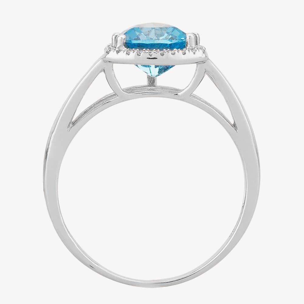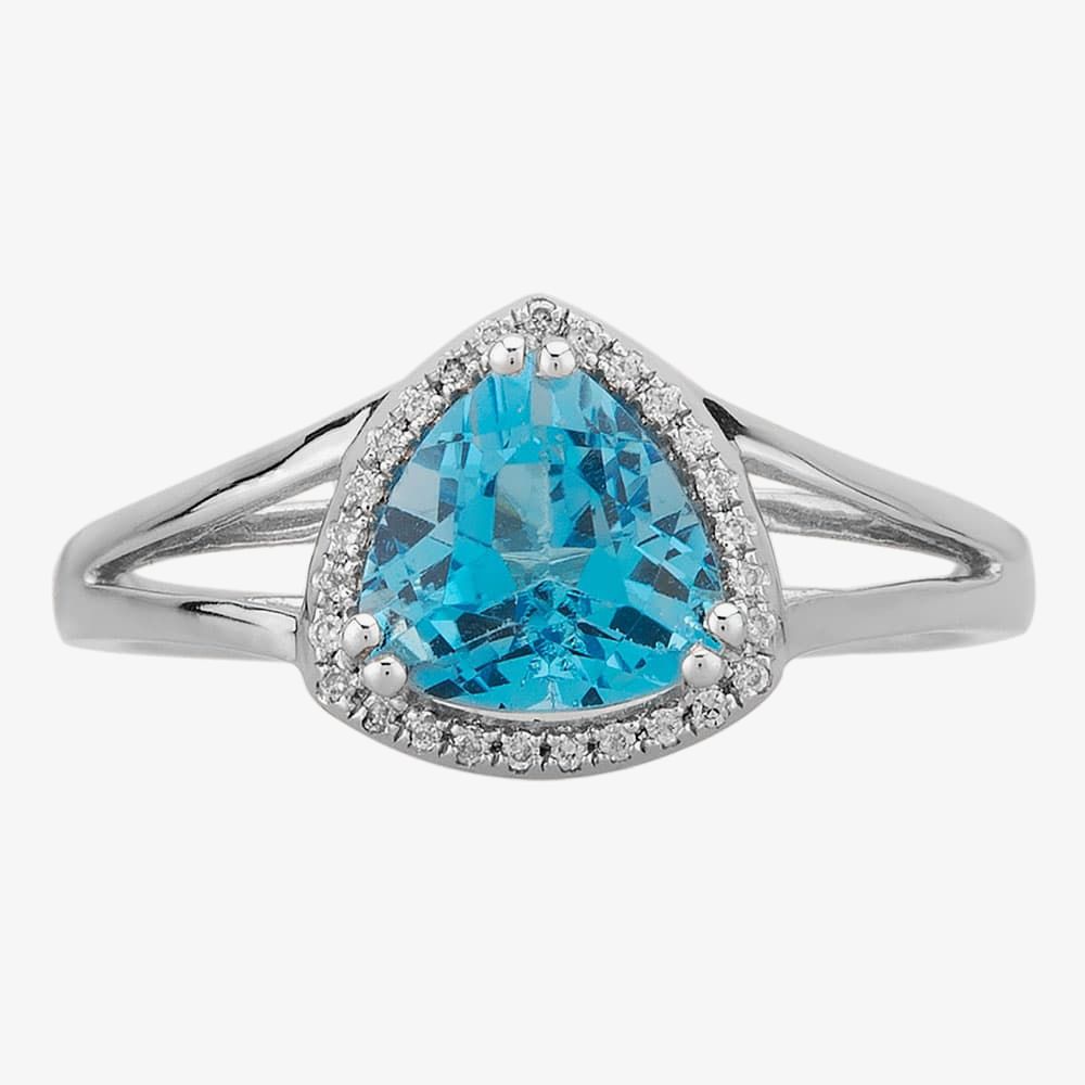 Add a bright pop of colour to your formal engagements with this beautiful trillion-cut blue topaz ring. Set in cool-hued 9ct white gold and surrounded by a diamond halo, this aqua blue stone is perfect for those born in December.
