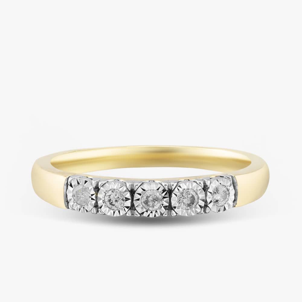 This exquisite half eternity ring is crafted from 9ct yellow gold and adorned with 0.10ct of sparkling white diamonds, offering a perfect blend of elegance and timeless beauty.