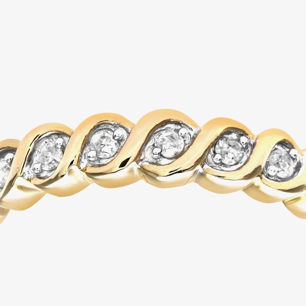 This beautiful half-eternity ring is crafted in 9ct yellow gold & features claw set sparkling diamonds with a total carat weight of approximately 0.10ct in an eye-catching swirl design. This ring is a perfect stand-alone piece or ideal for layering & combining with other rings to create your unique look.