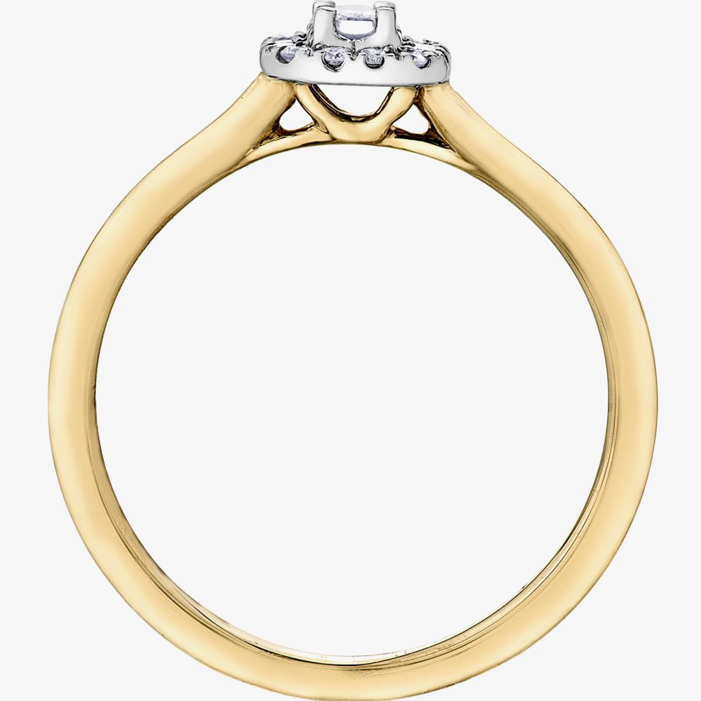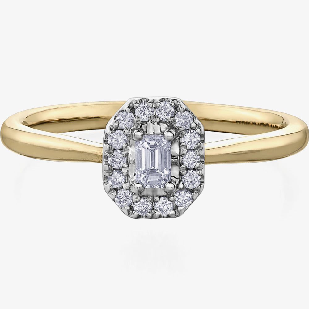 This elegant ring features a 9ct Yellow Gold band and an emerald cut 0.10ct diamond surrounded by a further 14 diamonds set in 9ct White Gold, giving a total weight of 0.198ct.