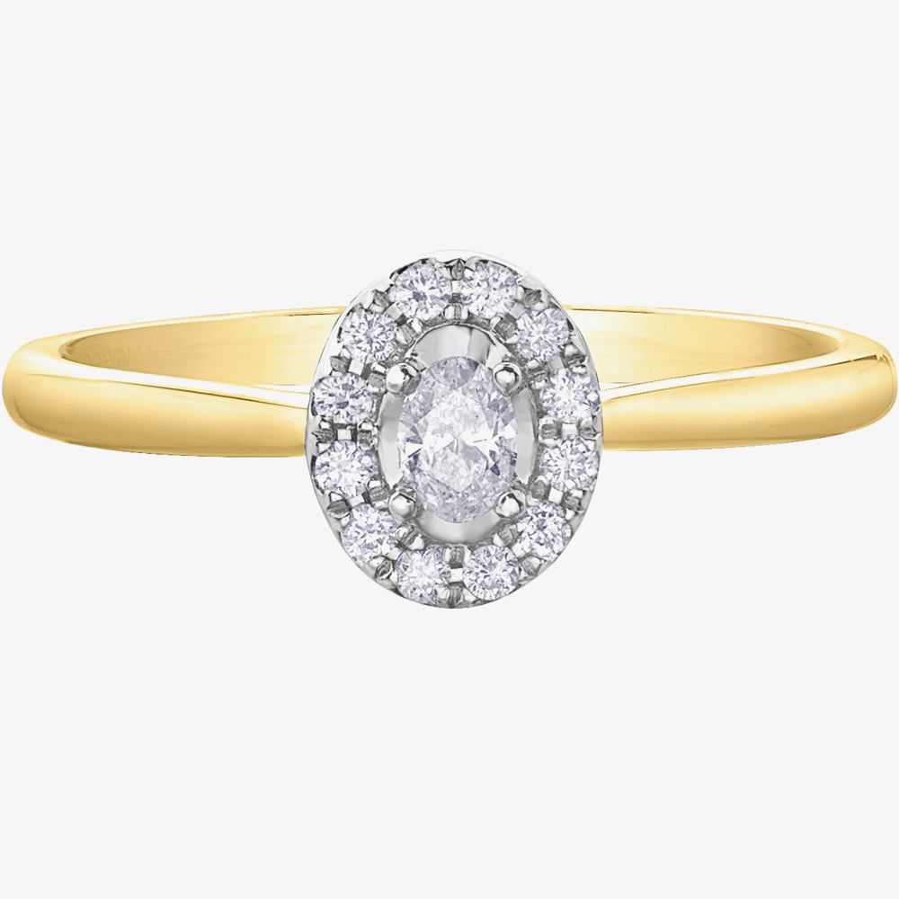 This ring features a 9ct Yellow Gold band and an oval cut 0.10ct diamond in a four-claw 9ct White Gold setting, surrounded by a halo of a further 12 diamonds, giving a total weight of 0.20ct.
