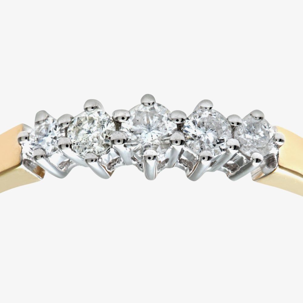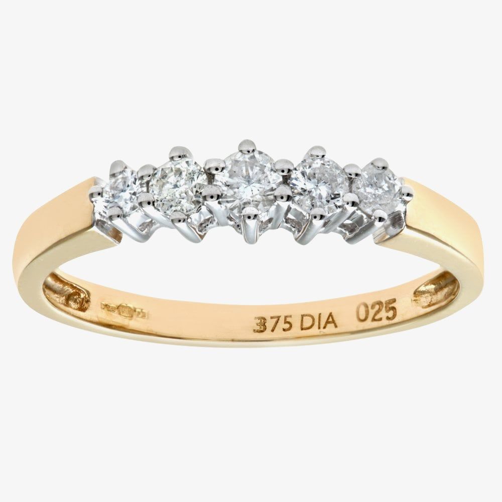 This attractive five stone ring is crafted in 9ct yellow gold & features brilliant cut claw set graduating diamonds which have a total carat weight of 0.25ct. This ring is a perfect stand-alone piece or ideal for layering & combining with other rings to create your own unique look.