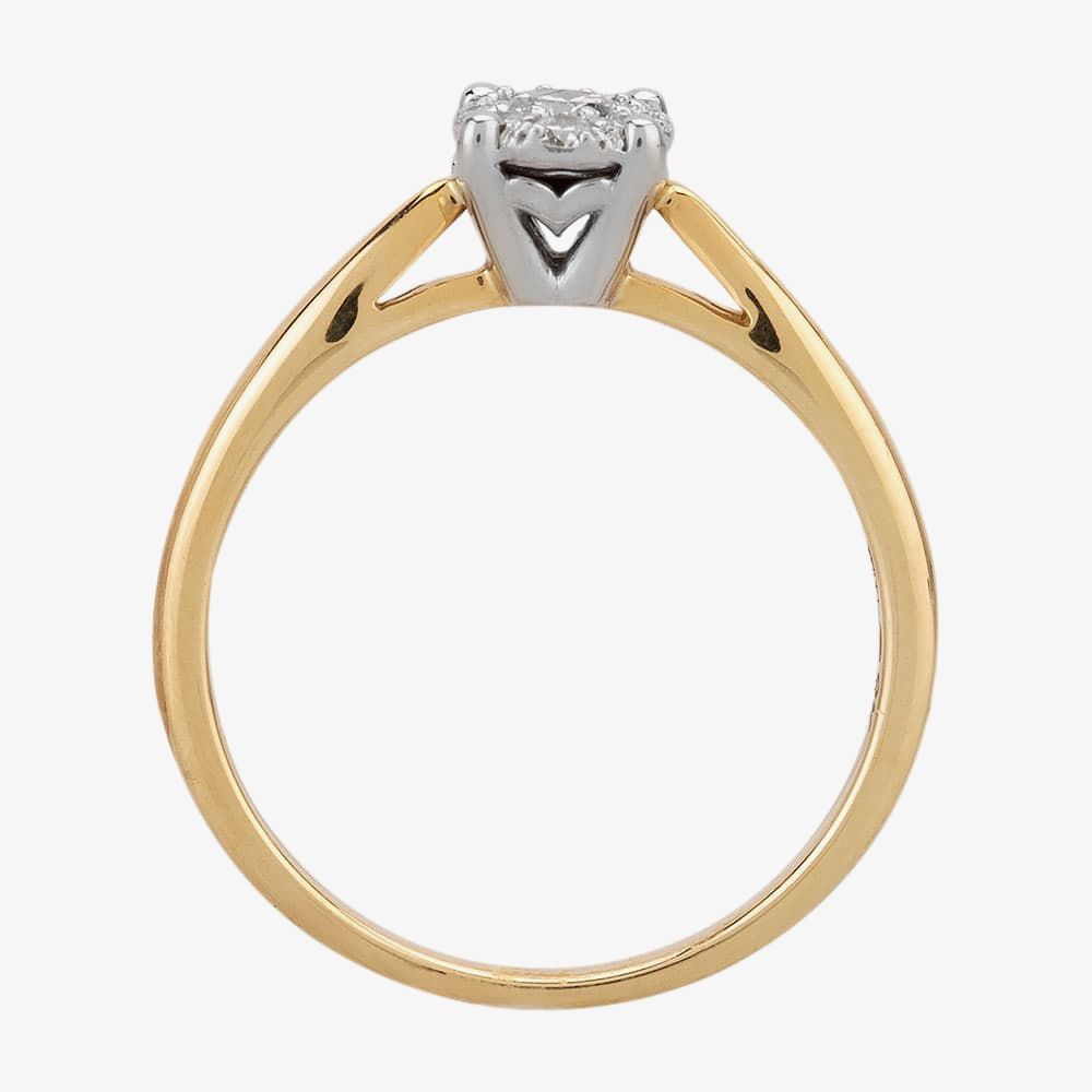 A 0.42ct diamond cluster ring, where a white gold V-basket head has been attached to a 9ct yellow gold shank to create the mount. A central 0.23ct round brilliant diamond has been given a pavé-set halo of graduated smaller diamonds to create the oval cluster, which is decorated with four claws to give the illusion of a larger single stone.