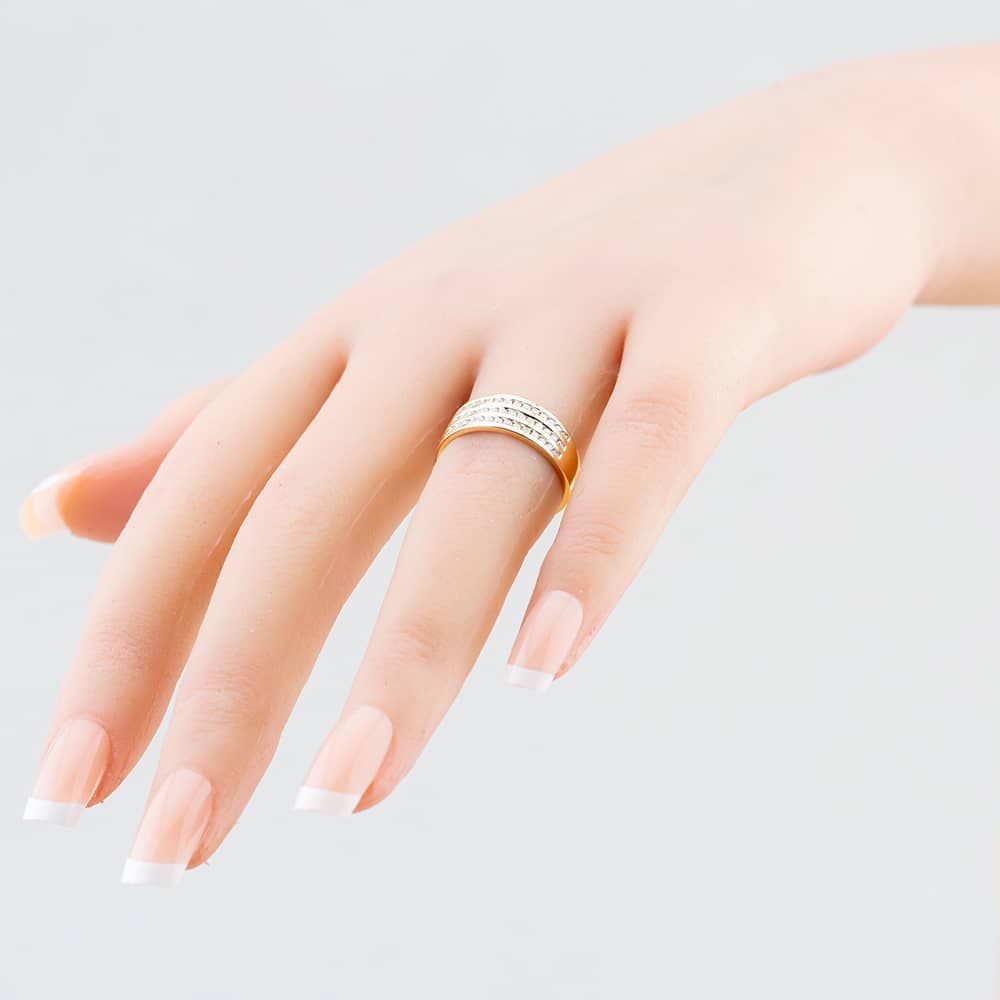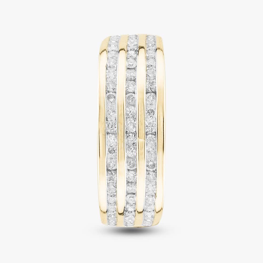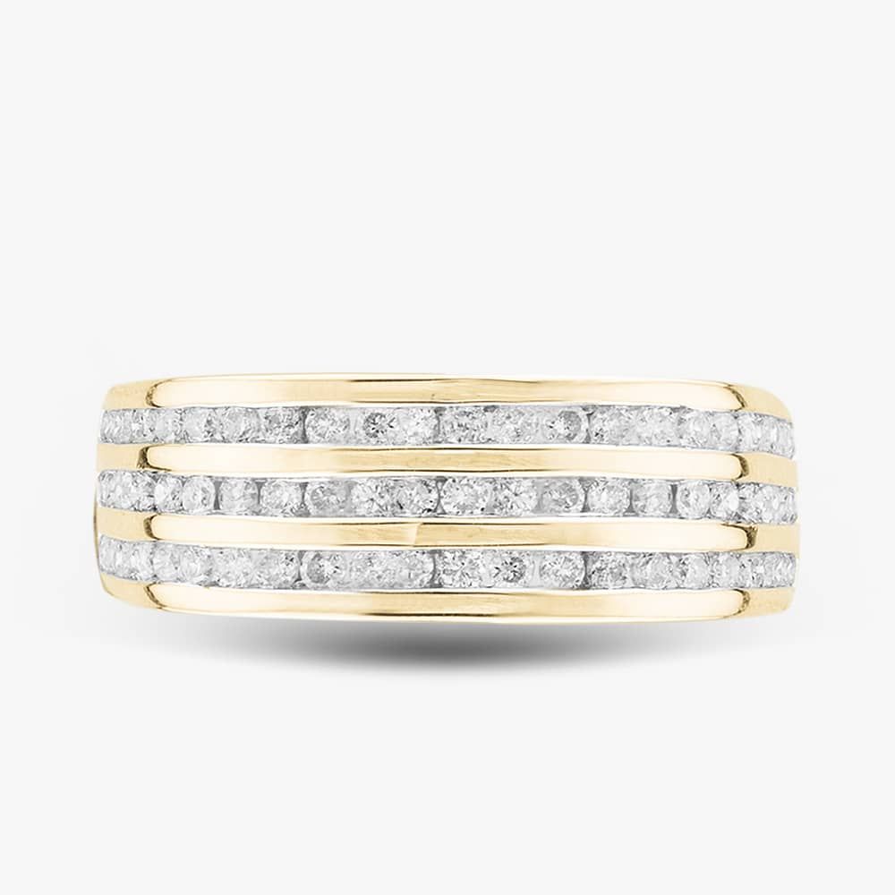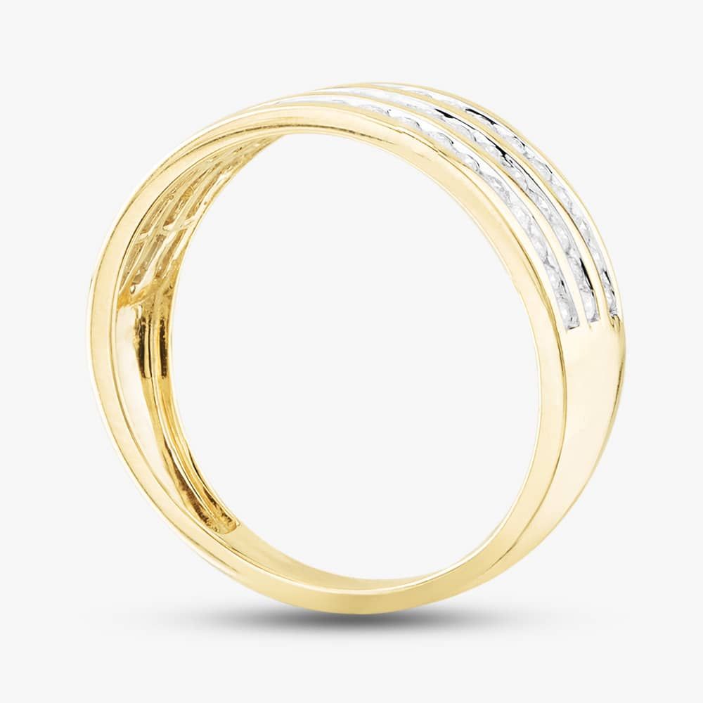 This elegant three-row ring is crafted from 9ct yellow gold and features 0.50ct of brilliant-cut white diamonds, beautifully set in a channel design across half the band.