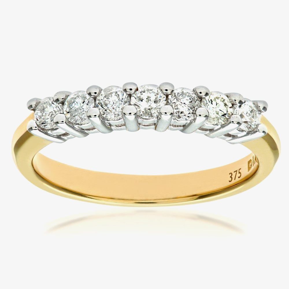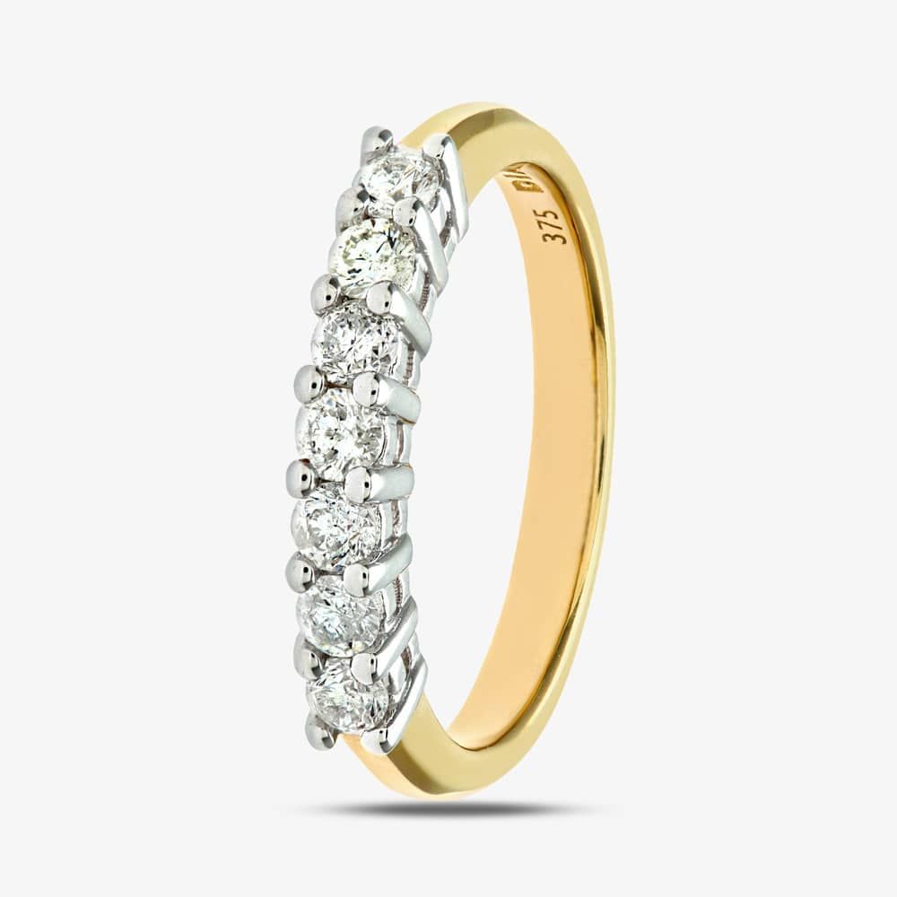 This attractive half eternity ring is crafted in 9ct yellow gold & features seven brilliant cut claw set diamonds which have a total carat weight of 0.50ct. This ring is a perfect stand-alone piece or ideal for layering & combining with other rings to create your own unique look.