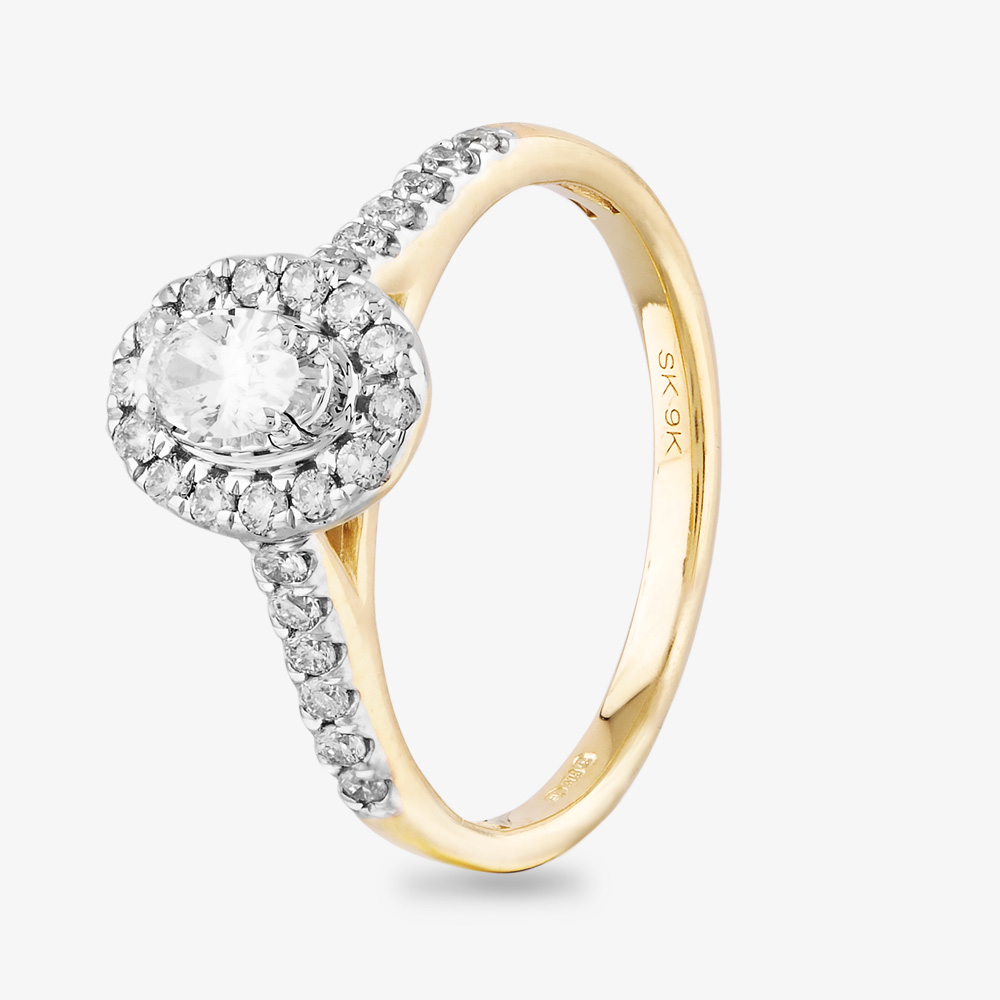 Created in 9ct Yellow Gold, this stunning ring features an oval diamond, framed by further diamonds and diamond set shoulders, giving a total weight of 0.50ct.