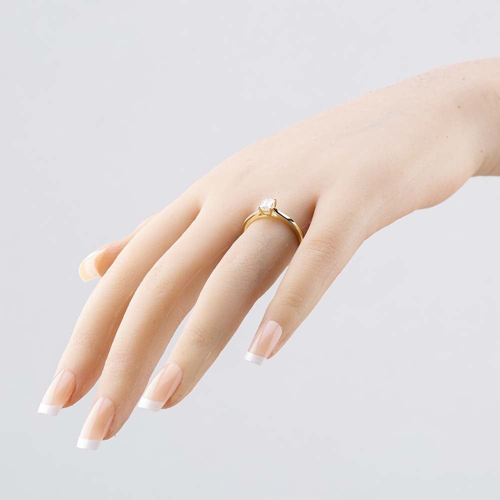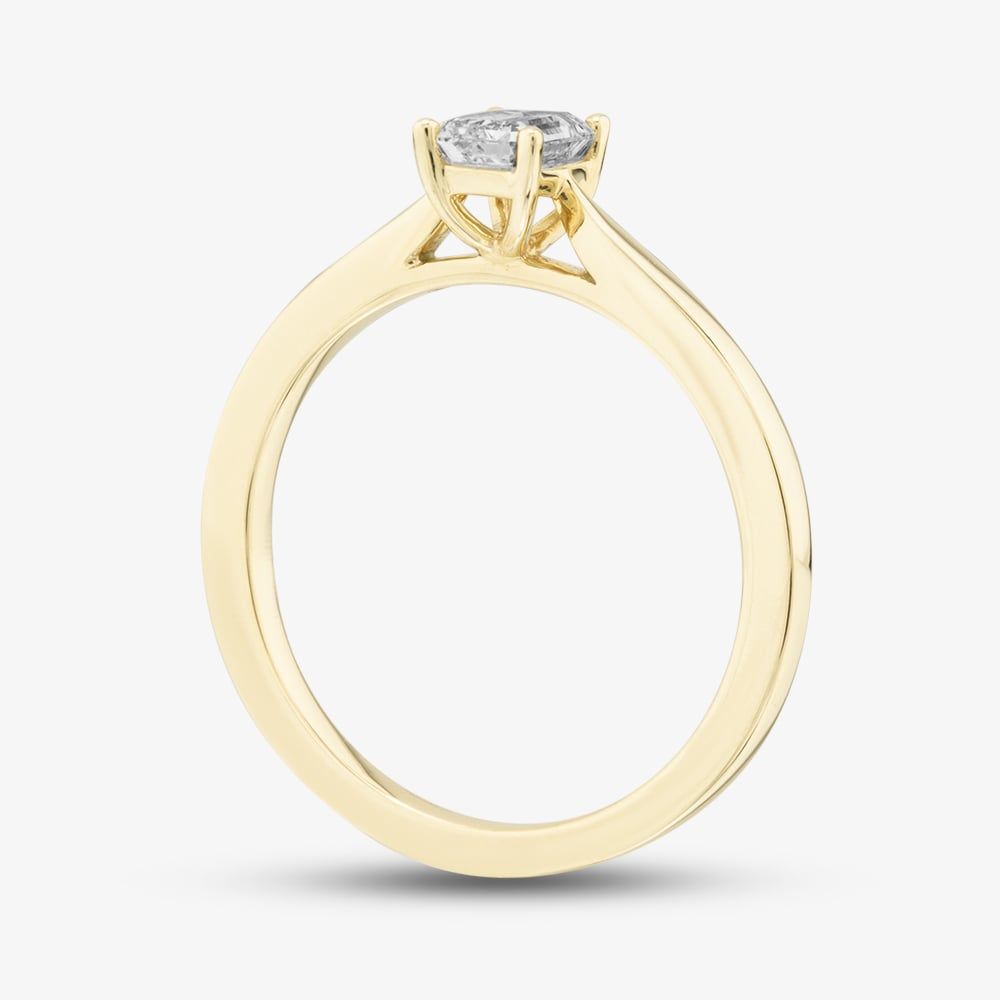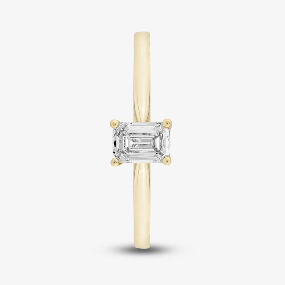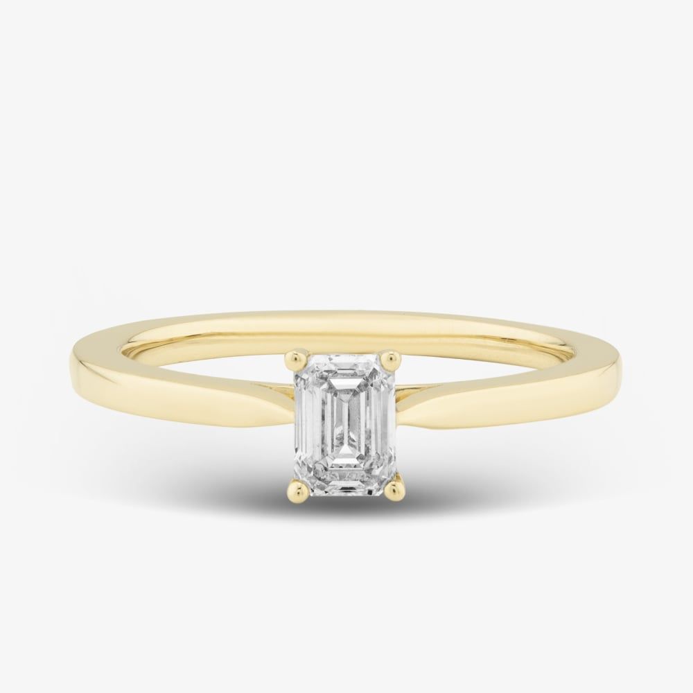 This exquisite 9ct yellow gold ring showcases a 0.50ct emerald-cut diamond solitaire, with H colour and SI2 clarity. The sleek, sophisticated design highlights the diamond's stunning brilliance and timeless elegance, making it a perfect choice for any special occasion.