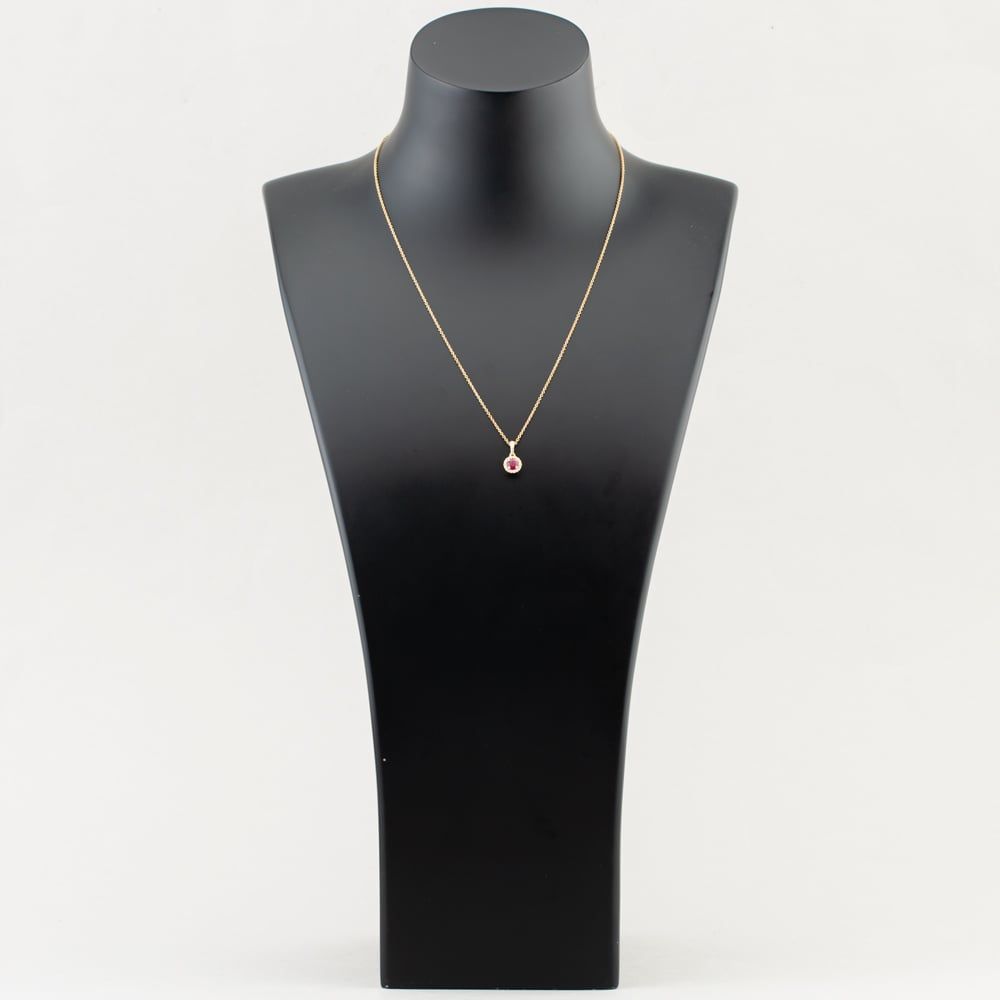 This stunning 9ct yellow gold necklace features a dazzling halo pendant, showcasing a 0.51ct brilliant-cut ruby as its vibrant centrepiece. Surrounding the ruby is a halo of sparkling diamonds, with a total weight of 0.13ct, adding an exquisite touch of brilliance. Suspended on a delicate trace chain, this necklace is a timeless and elegant piece, perfect for adding a luxurious accent to any outfit.