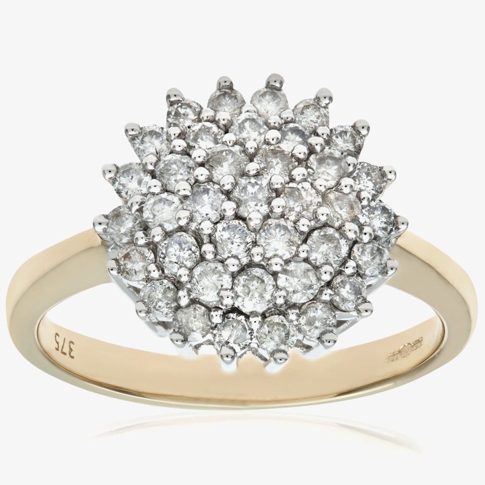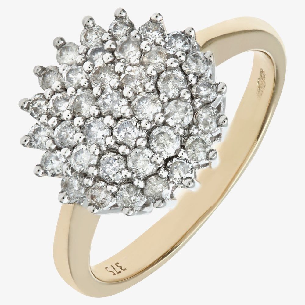 This elegant cluster ring is crafted in 9ct yellow gold & features a round shape design set with claw set sparkling diamonds which has a total carat weight of 0.75ct. This ring is a perfect stand-alone piece or ideal for layering & combining with other rings to create your own unique look.
