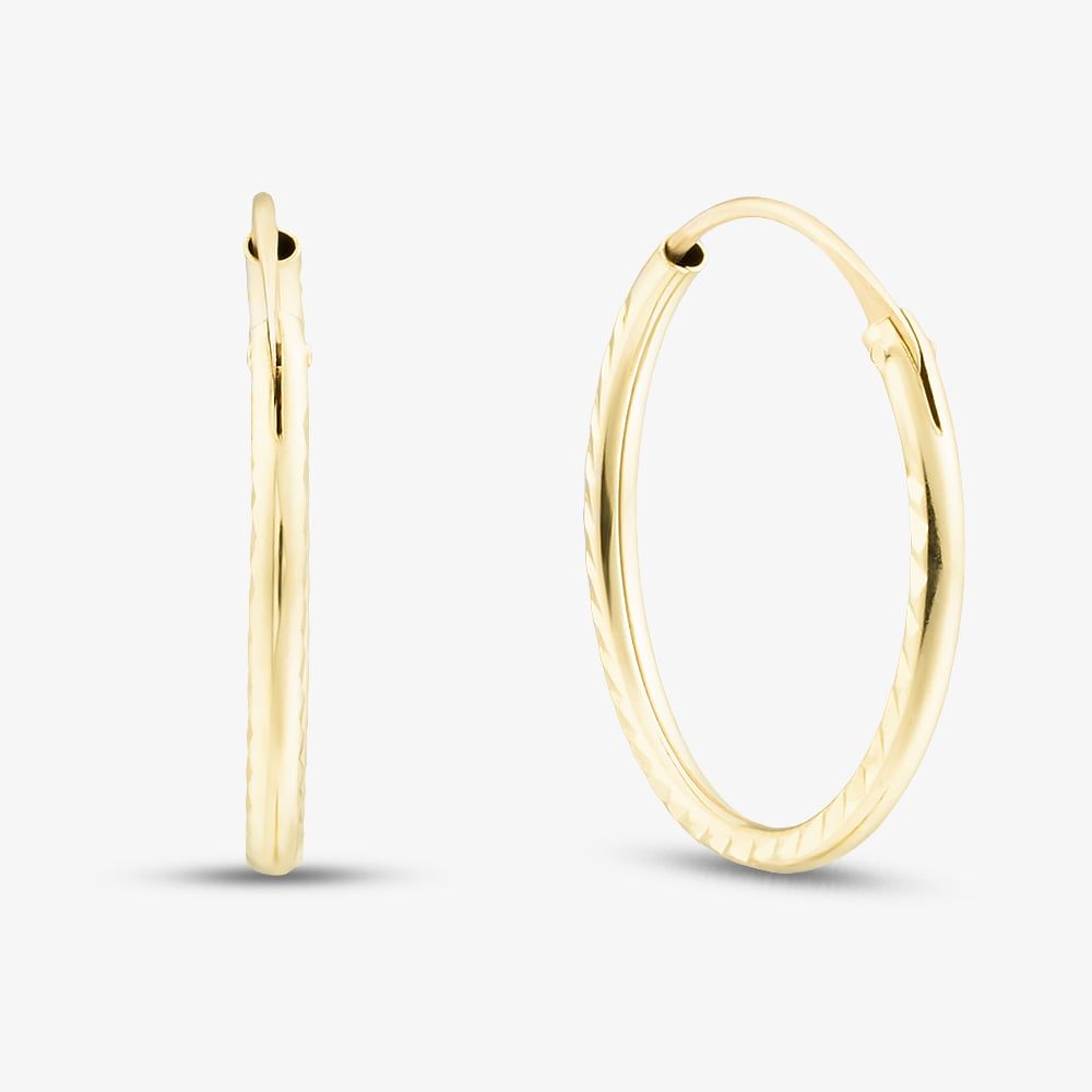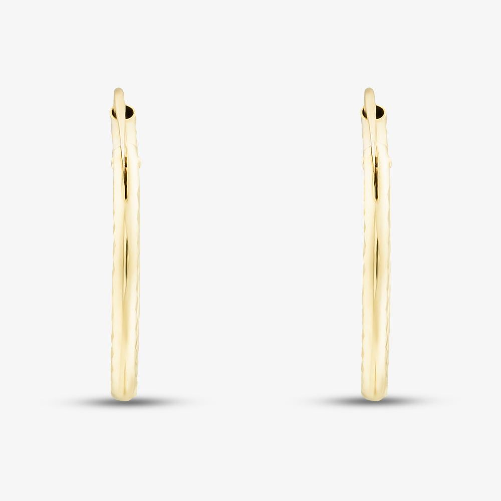 Crafted from rich 9ct yellow gold, these elegant hoops feature a diamond-cut finish that reflects light beautifully for a subtle, eye-catching sparkle. They offer a secure and comfortable fit—perfect for day-to-night wear. Whether worn alone for a minimal look or paired with other earrings, these hoops bring timeless style and everyday versatility to any outfit.