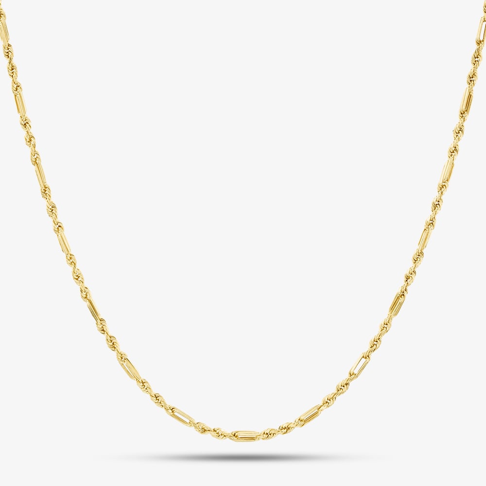 This 9ct yellow gold chain features a classic Figaro rope design, combining both style and durability. At 18 inches in length, the chain offers a sophisticated blend of interlocking links, alternating between short and elongated shapes for a distinctive look. Ideal for wearing alone or paired with a pendant, this versatile chain adds a touch of elegance to any ensemble.