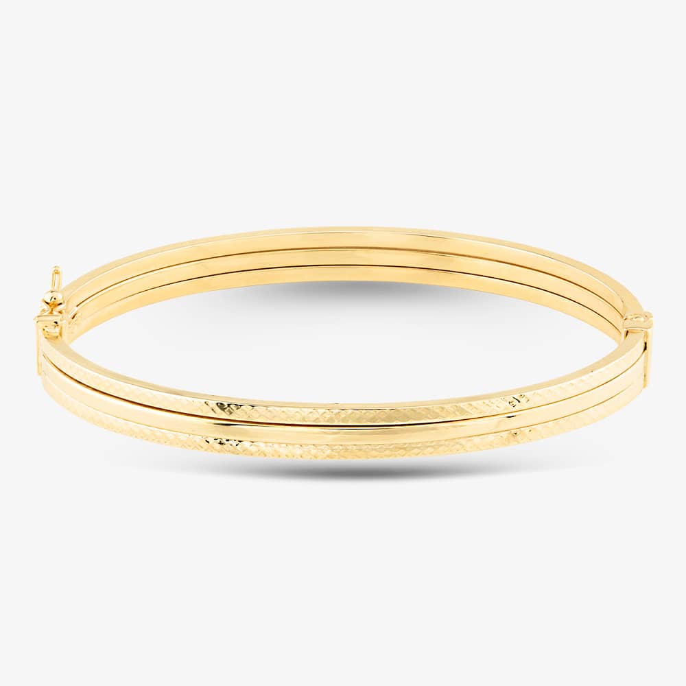 This hinged bangle is delicately crafted from 9ct yellow gold and features three polished lines with a pattern design, securely fastened with a box clasp.