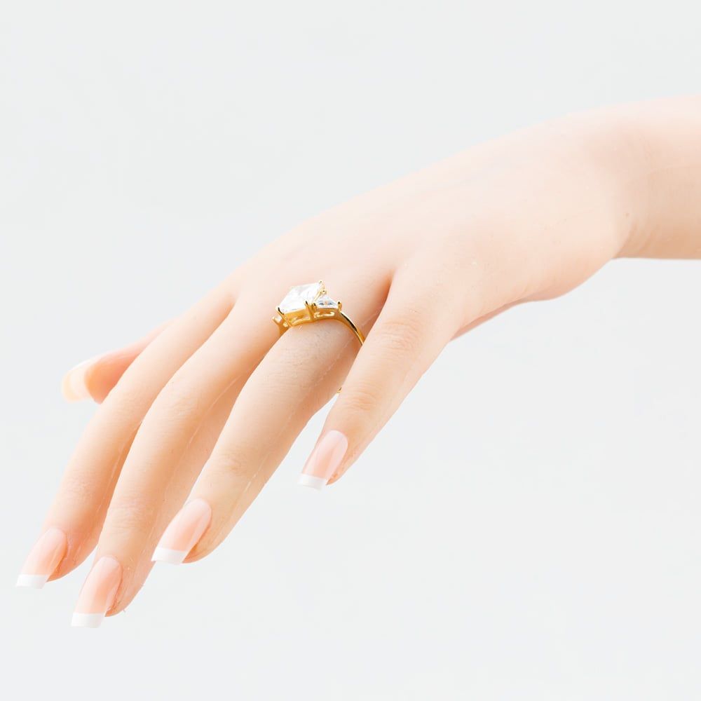 A ring set to suit a princess, the 9ct Yellow Gold 3-Stone Crystal Ring 1.84.5109 is a must-have for anyone who is fond of unique style and sparkle. Made from polished 9ct yellow gold, this three stone ring has a 1mm ring shank and features an 8mm x 10mm rectangular cubic zirconia centre stone adorned by 6mm x 6mm triangular cubic zirconia crystals in a claw setting - giving anyone who wears this ring enough sparkle to last a lifetime.