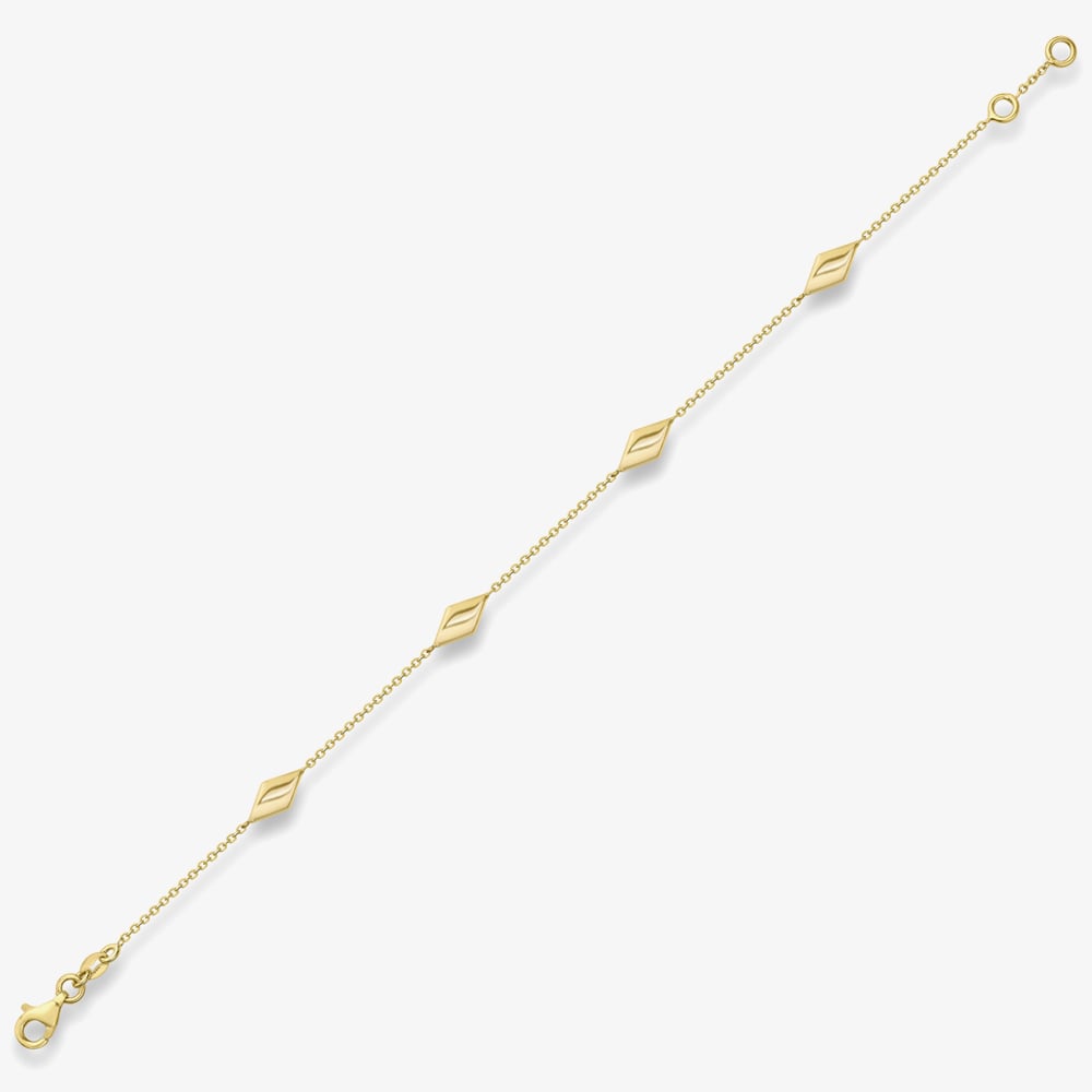 This elegant 7.5-inch chain bracelet has been created in 9ct yellow gold & features four highly polished horizontal kite motifs on a fine trace chain & is completed with a bolt ring clasp fastening. Dimensions: 10 x 5mm.