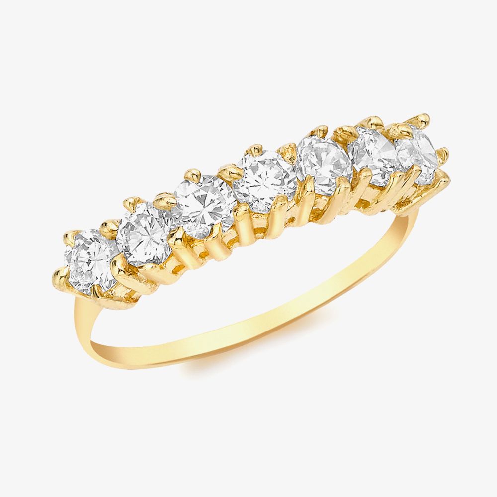 A ring set to suit a princess, the 9ct Yellow Gold 7-Stone Crystal Half Eternity Ring is a must-have for anyone who is fond of unique style and sparkle. Made from 9ct yellow gold, this half-eternity ring features seven 3mm round white cubic zirconia stones in a claw setting - giving anyone who wears this ring enough sparkle to last a lifetime and would make a beautiful engagement ring.