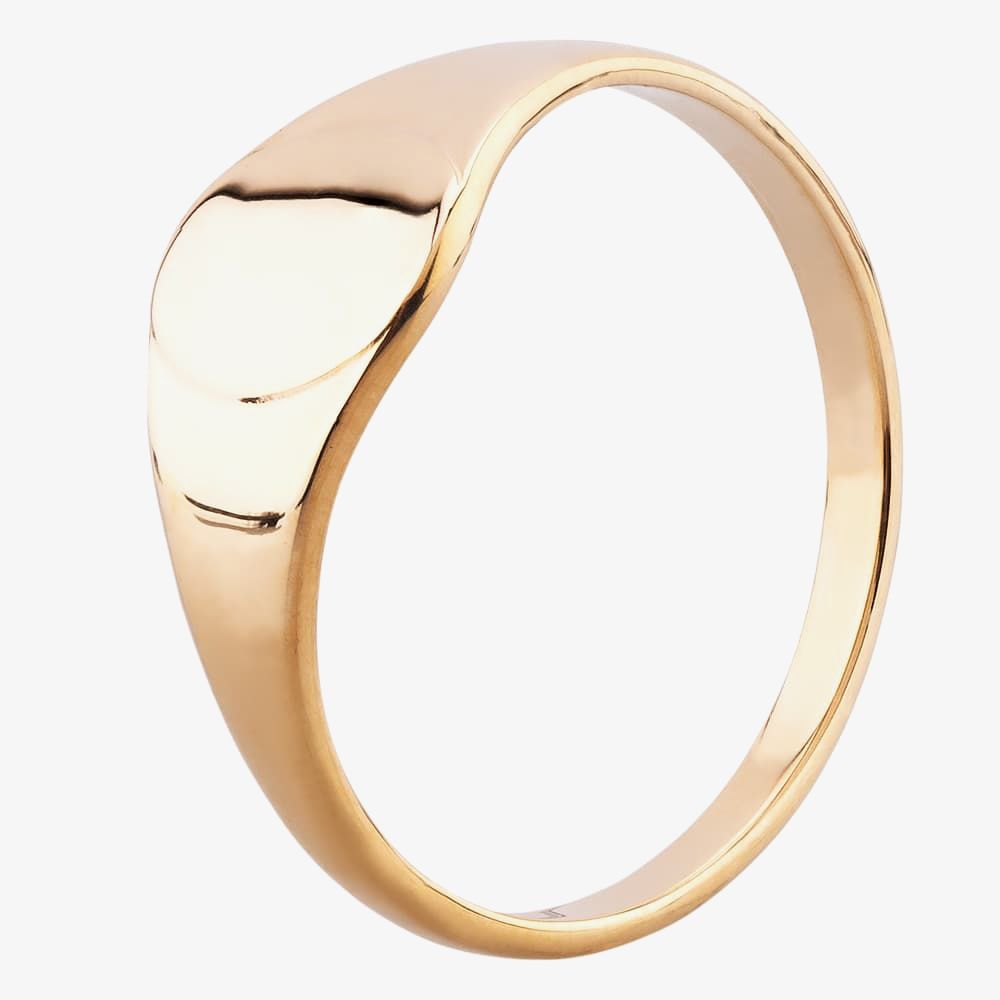A ladies oval signet ring stamped from 1.2mm thick 9ct Yellow Gold.