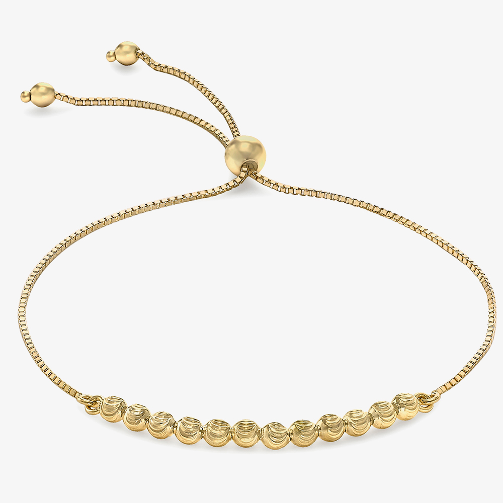 A fashionable addition to any jewellery box that will add elegant style, the 9ct Yellow Gold Adjustable Box Chain Bracelet 1.29.7389 offers a classically beautiful look to anyone who wears it. Made from 9ct yellow gold and measuring up to 23cm long and 0.8mm wide, this adjustable box chain toggle bracelet features 12 textured-finish 3mm wide polished yellow gold balls and can be worn to suit your preferred fit.