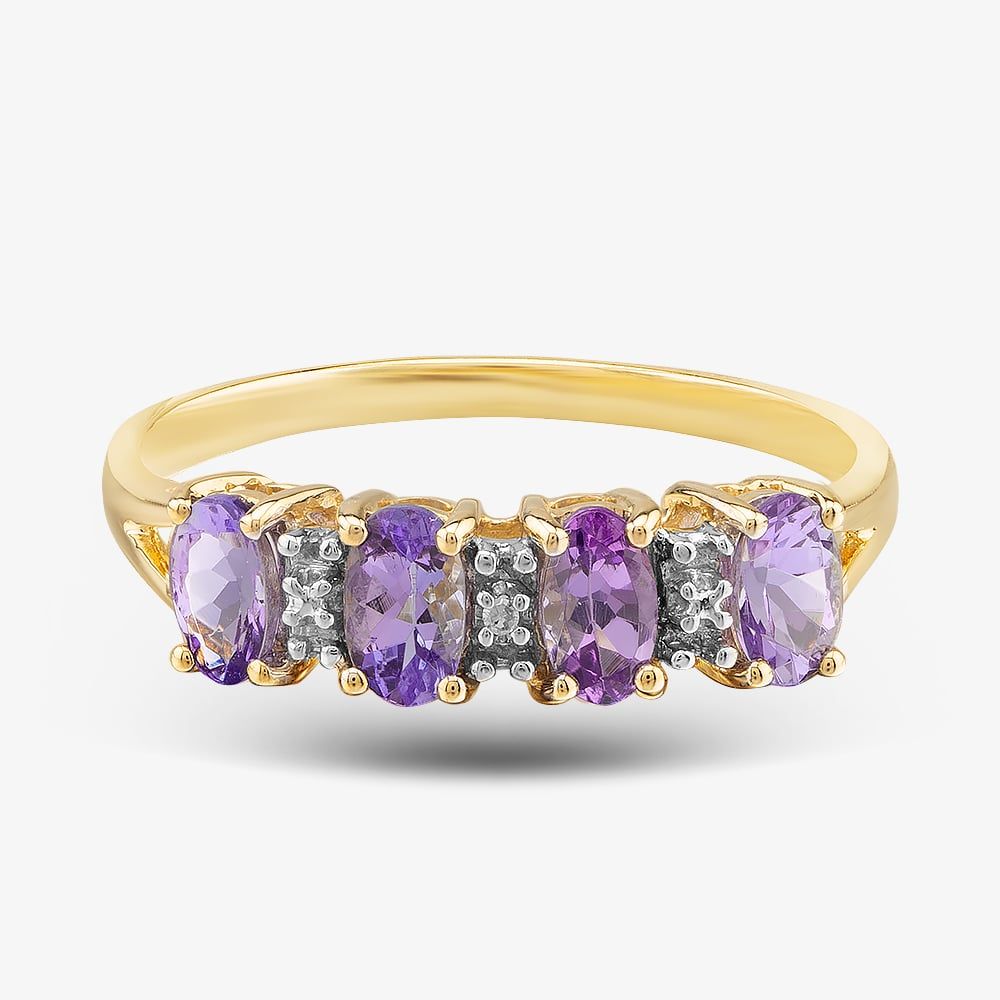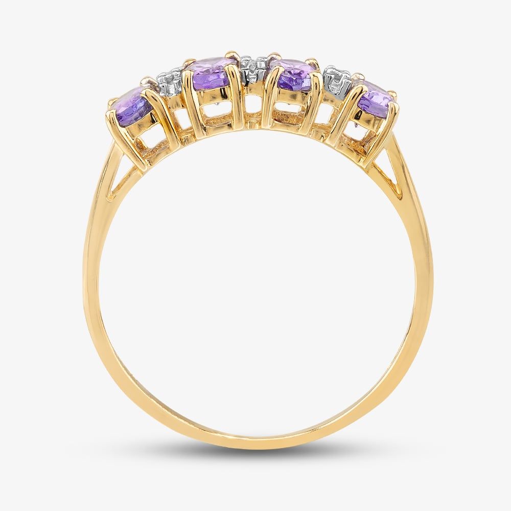 This beautiful ring has been created in 9ct yellow gold & features four oval cut claw set amethyst stones with a round claw set sparkling diamond in the centre. This ring makes an ideal eternity ring & is perfect for stacking with other rings to create your own unique look.