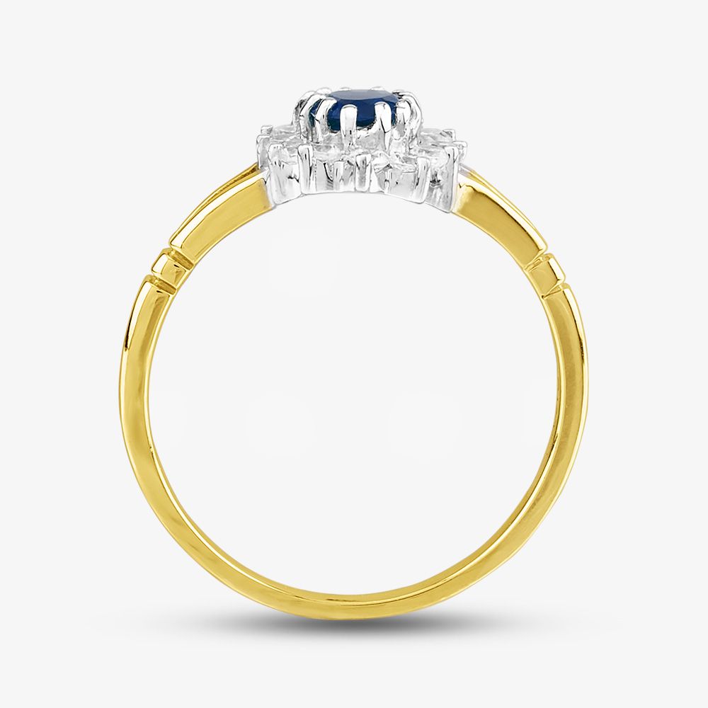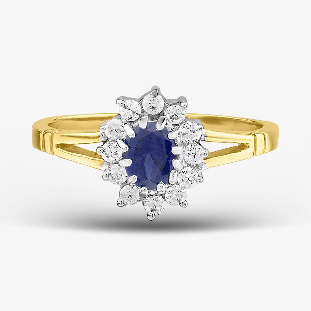 A simple yet classic cluster ring crafted in 9ct yellow gold with an oval blue crystal centre stone, clear crystal surround and an open shoulder design. This ring glistens and catches the light beautifully, the perfect dress ring for that special occasion.