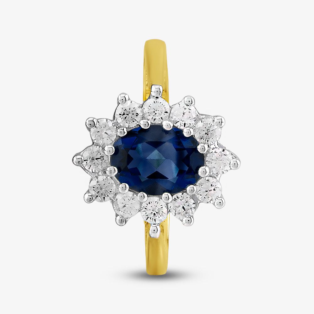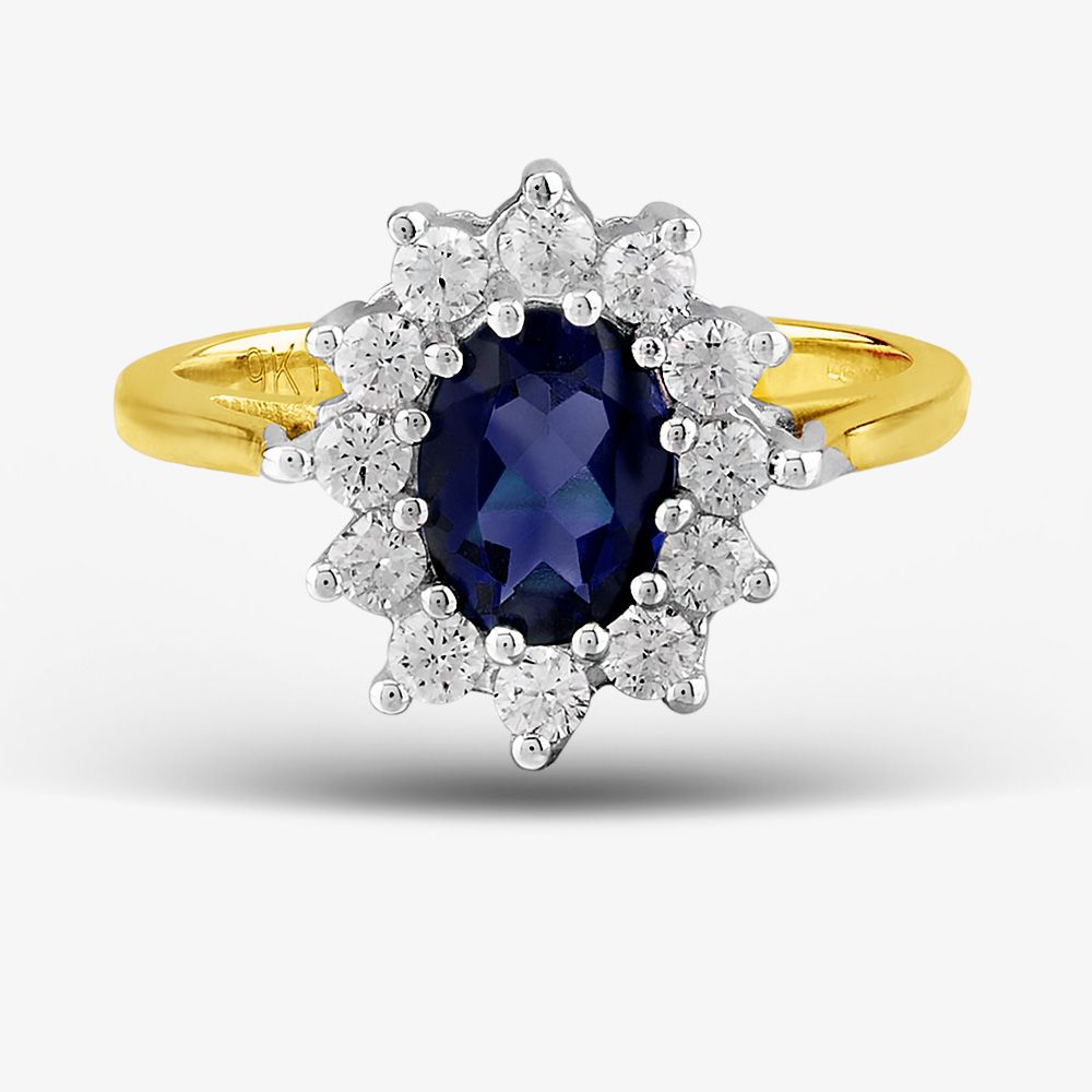 A simple yet classic cluster ring crafted in 9ct yellow gold with an oval blue crystal centre stone and clear crystal surround. This ring glistens and catches the light beautifully, the perfect dress ring for that special occasion.